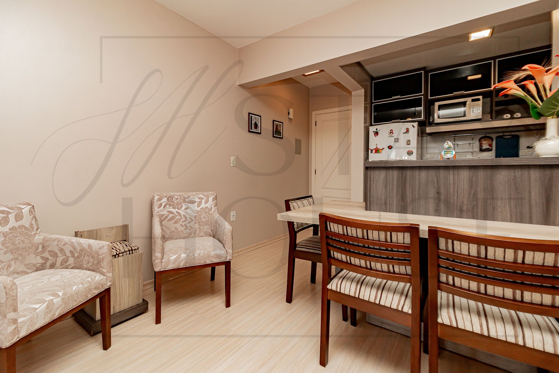* Cozinha integrada com a sala, equipada com utensílios e eletros essenciais