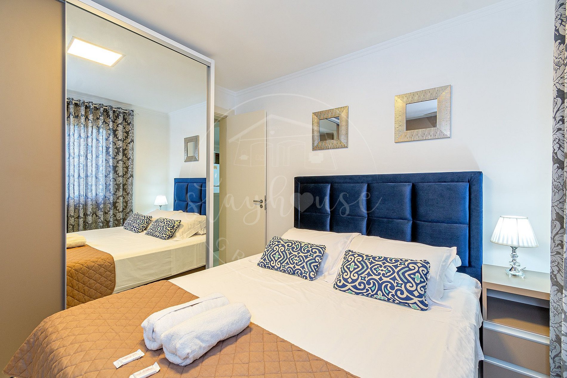 No dormitório uma cama queen para acomodar mais 2 pessoas, e um roupeiro amplo com espelhos.
