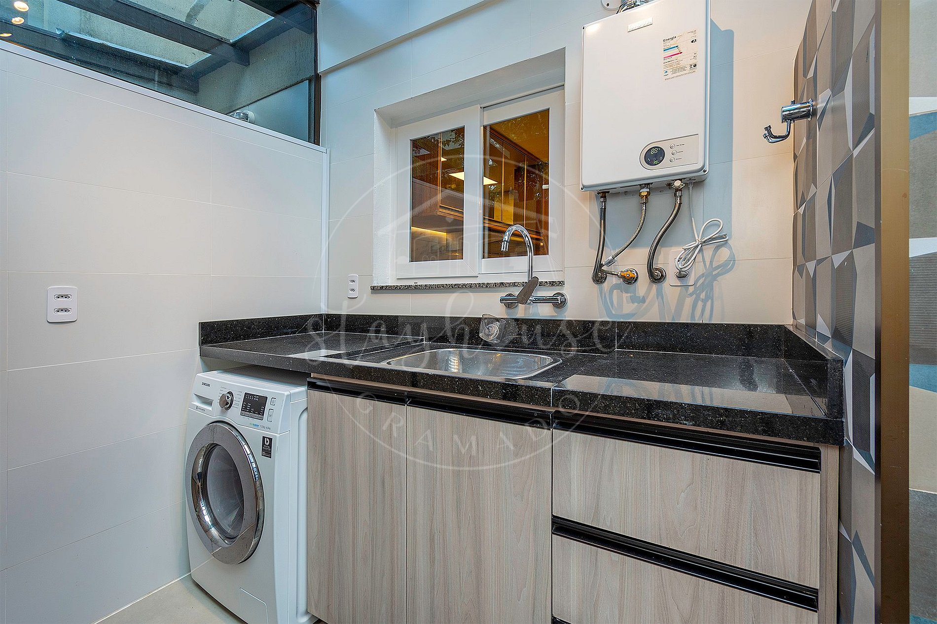 Área de serviço com lava e seca, e churrasqueira