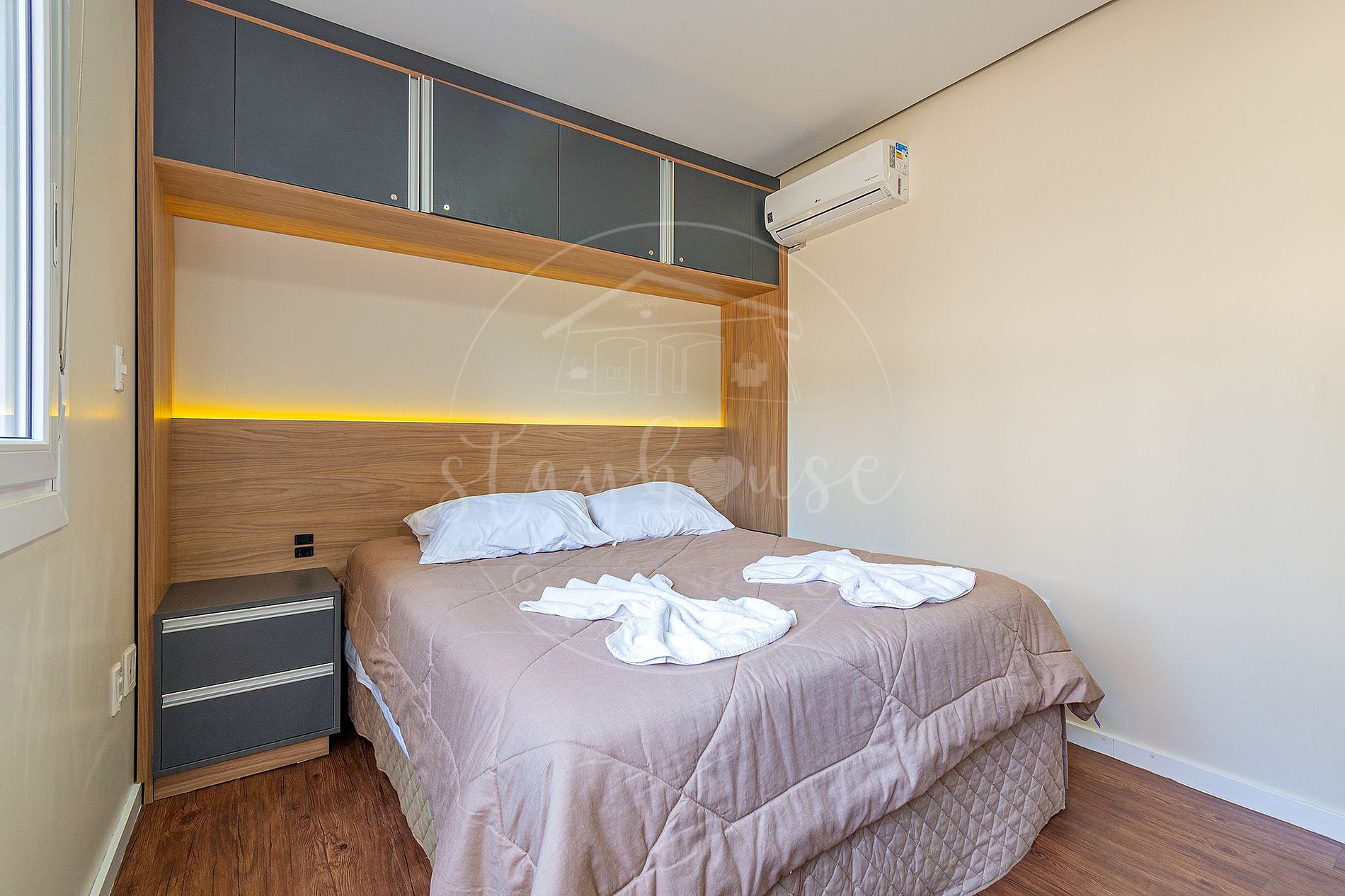 Sendo 1 dormitório com cama de casal e uma cama auxiliar, com TV smart, ar split quente e frio quente e frio na sala e dormitório, WI FI, na sala um sofá cama casal.