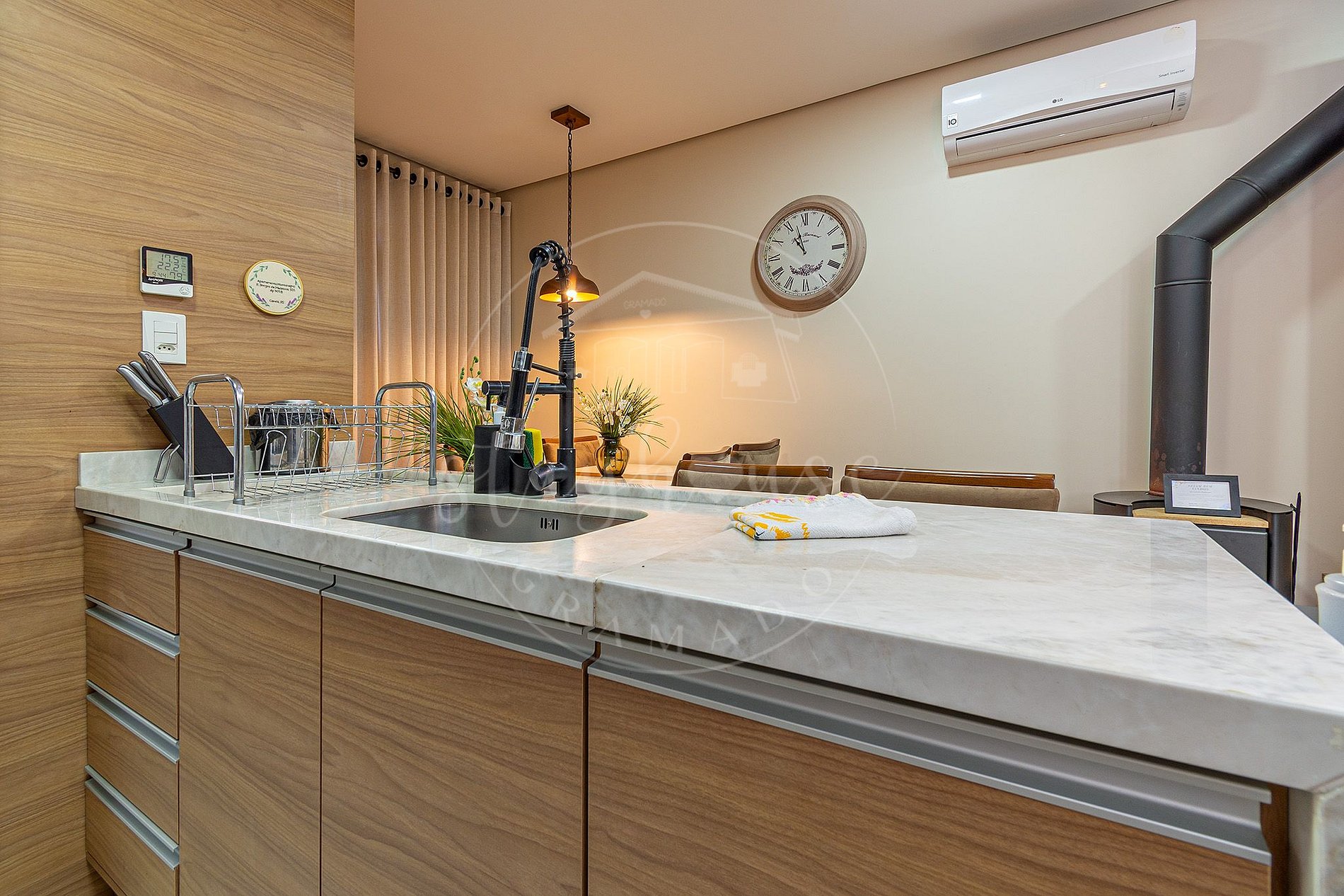 - Cozinha mobiliada equipada, ambiente de estar e jantar integrado com lareira, WI FI, TV SMART.