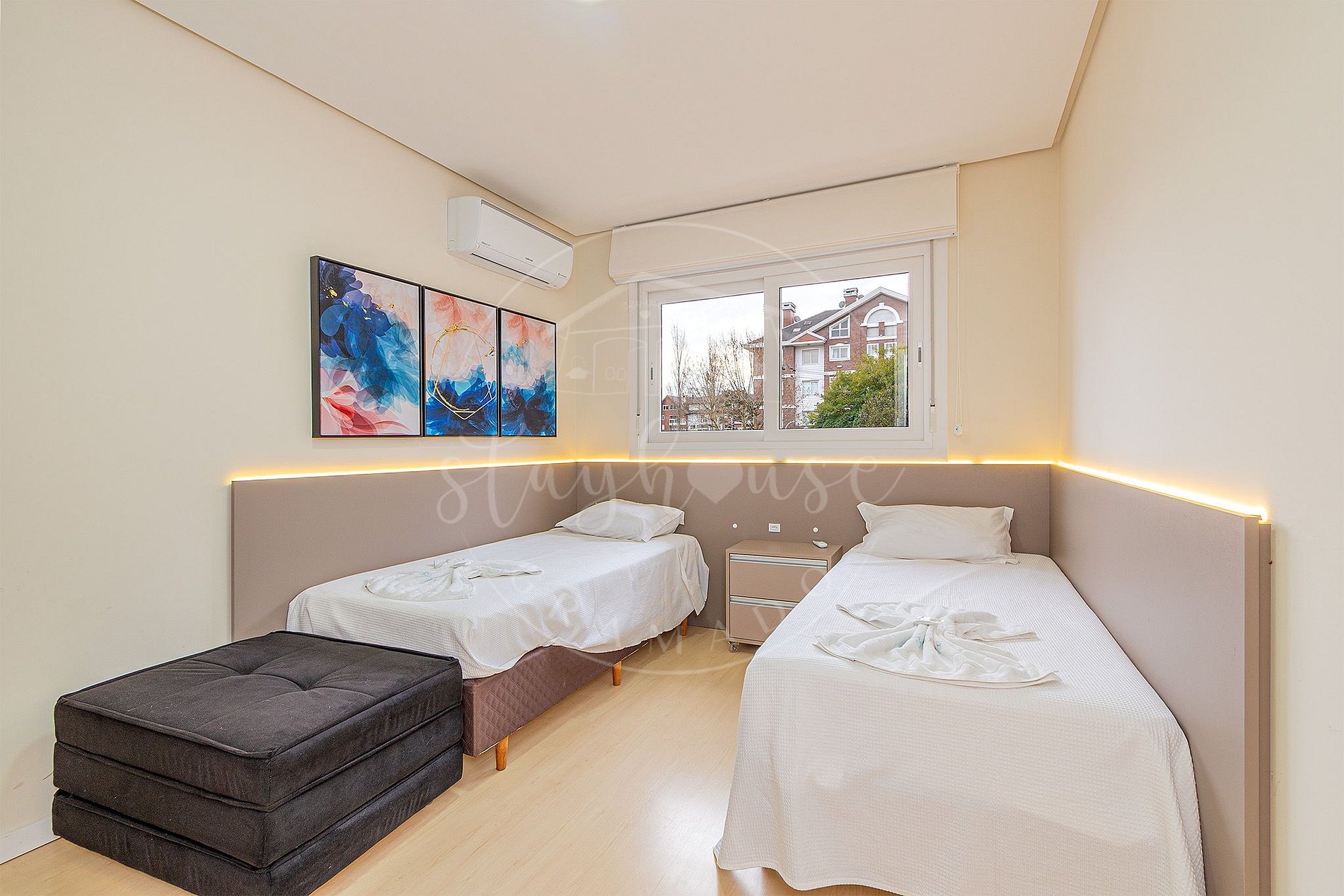 E no quarto de solteiro um puff cama solteiro que acomodaria bem uma criança