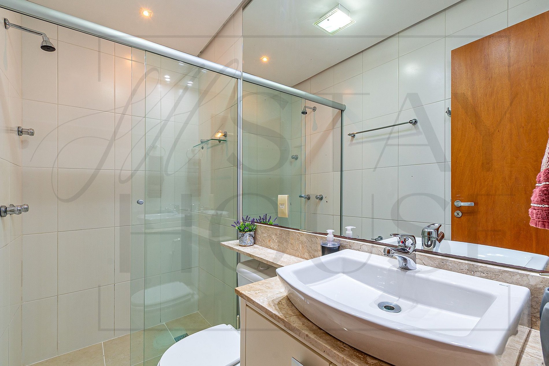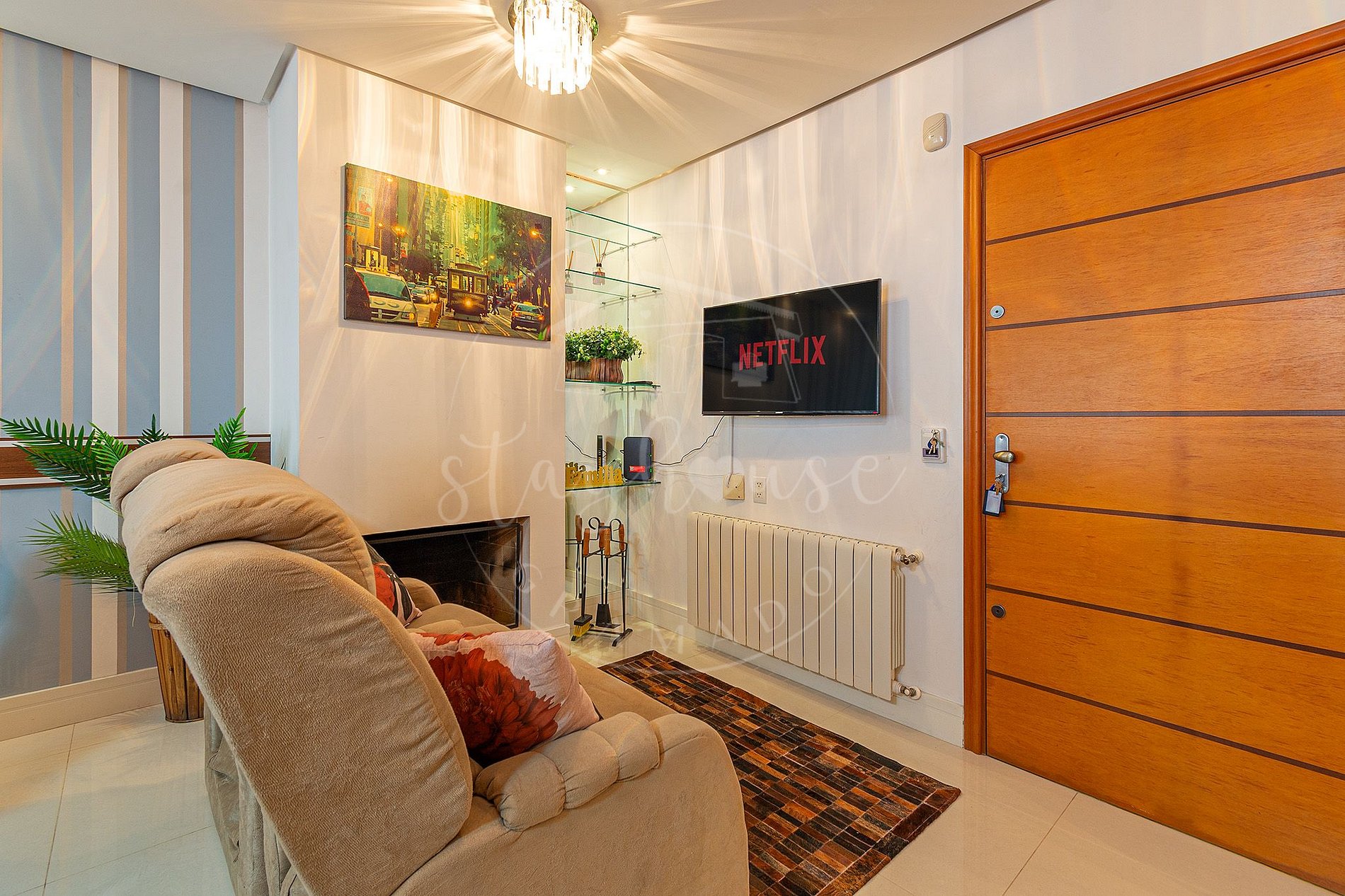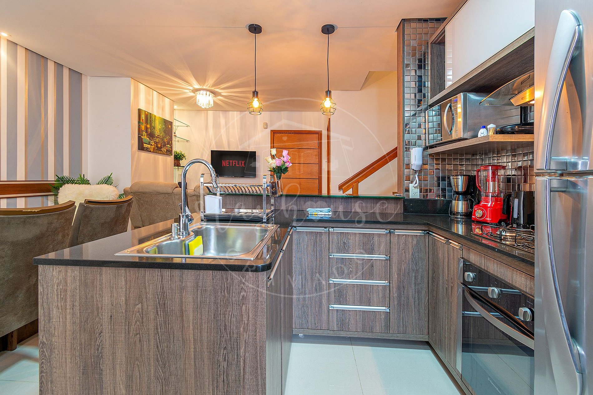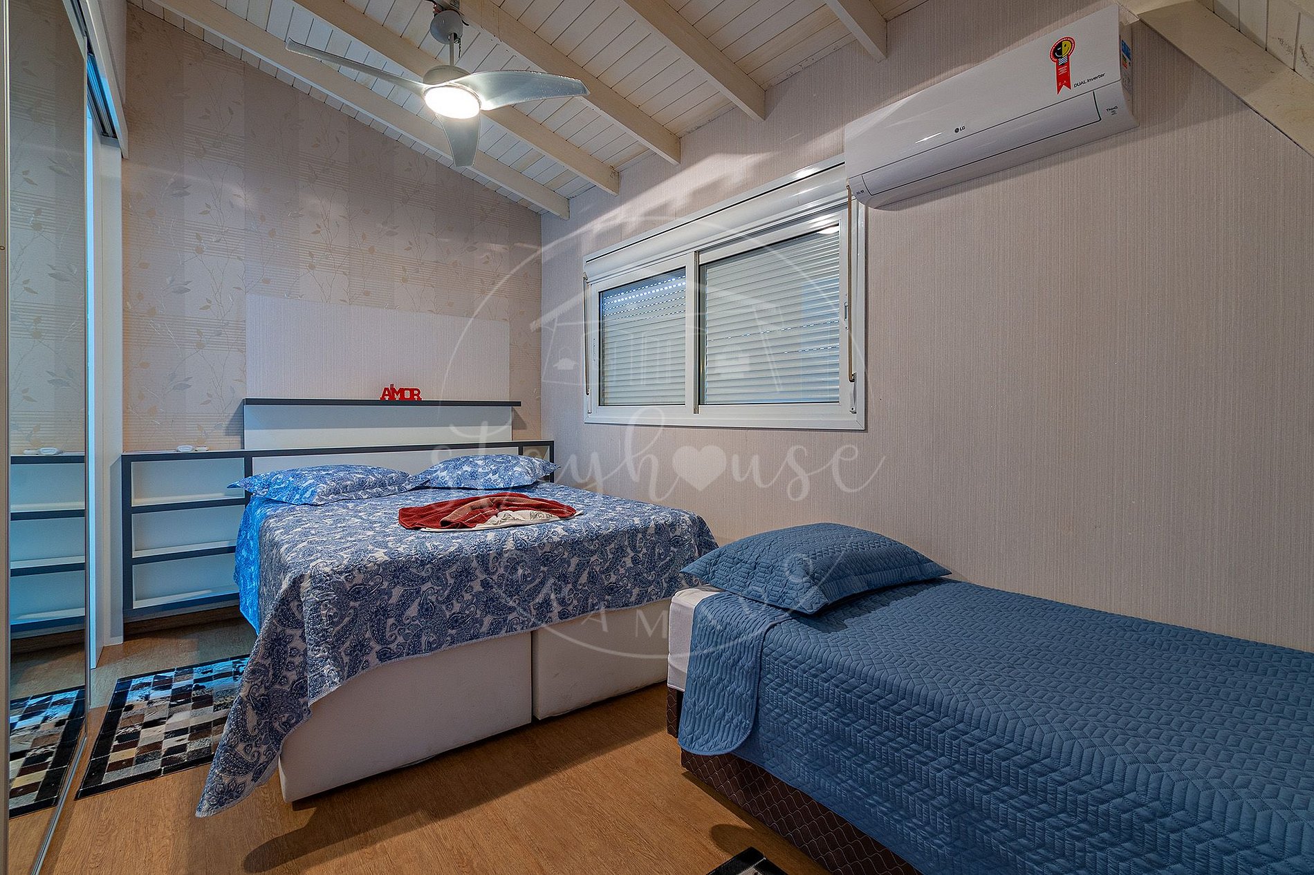 O apartamento tem duas suítes e uma sala e estar, ar split quente frio nas suítes e sala superior