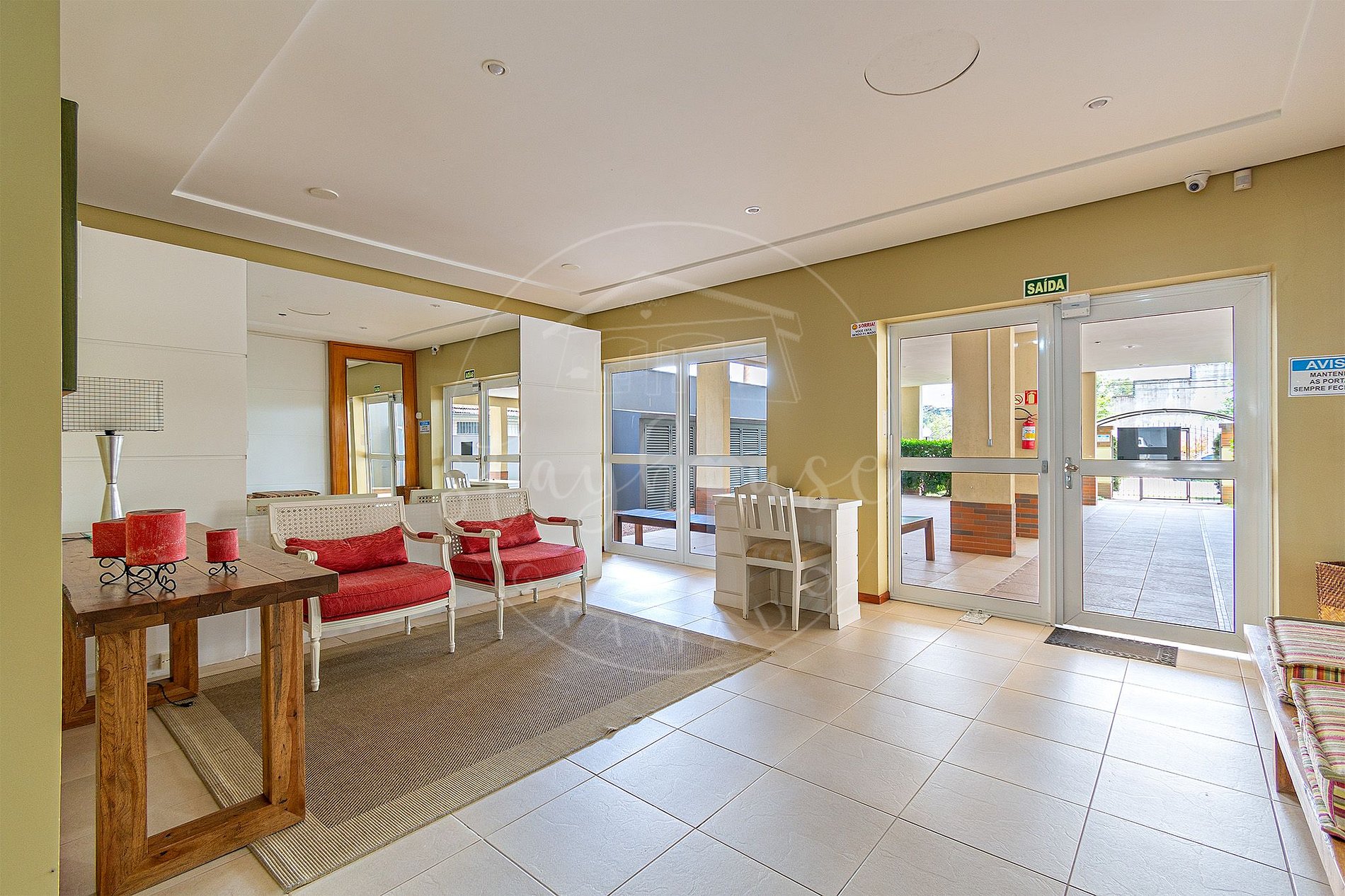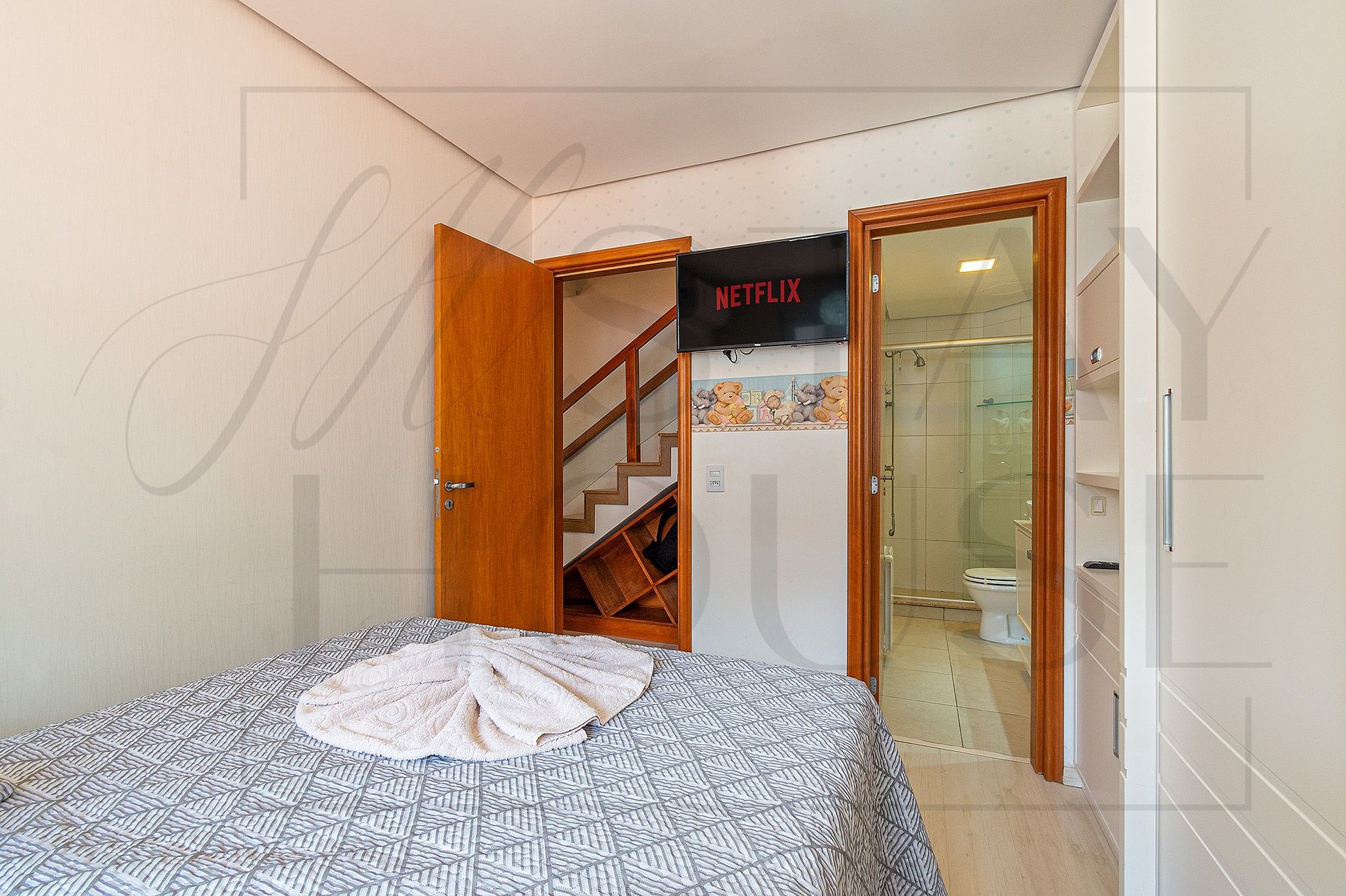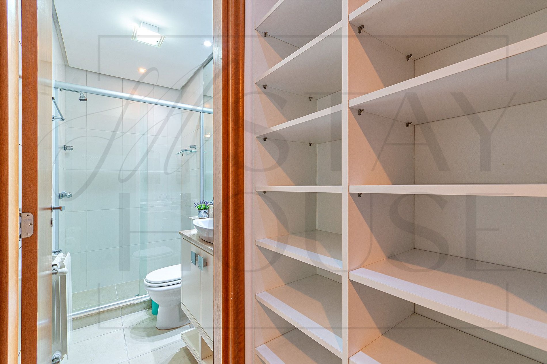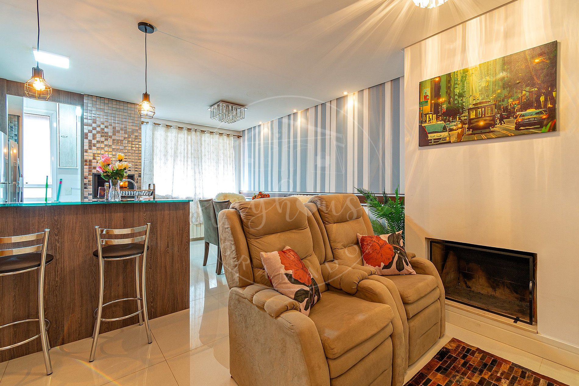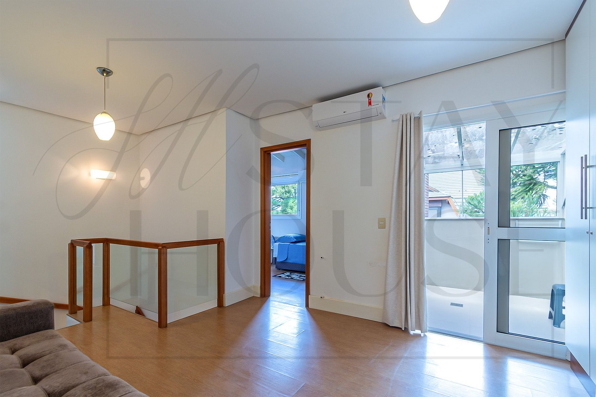 O apartamento tem duas suítes e uma sala e estar, ar split quente frio nas suítes e sala superior