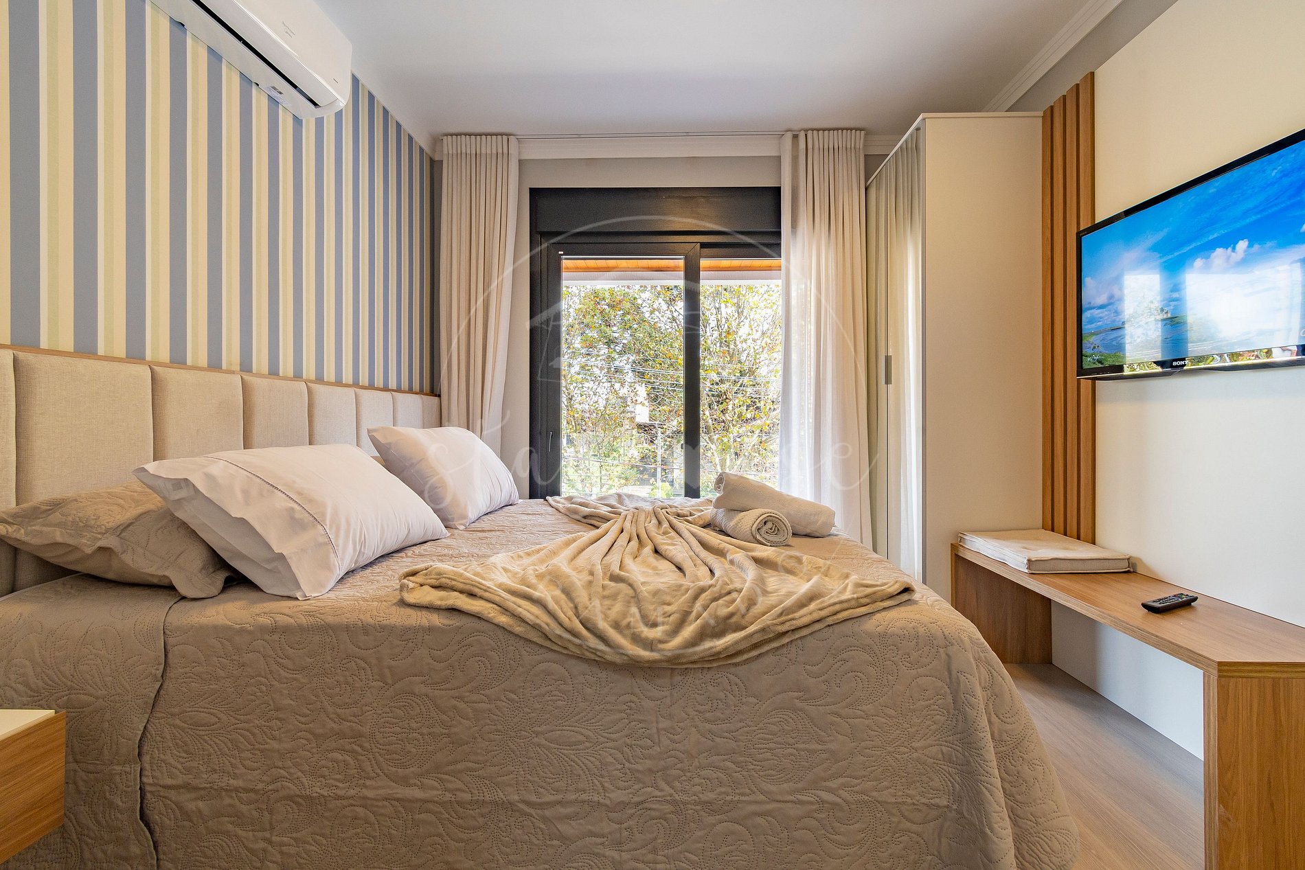 Duas suítes com cama queen, na suíte principal conta com uma Tv com canais comuns. Nas duas suítes temos roupeiros, banqueta pra calçar sapatos, ar quente e frio(split) e roupeiro.