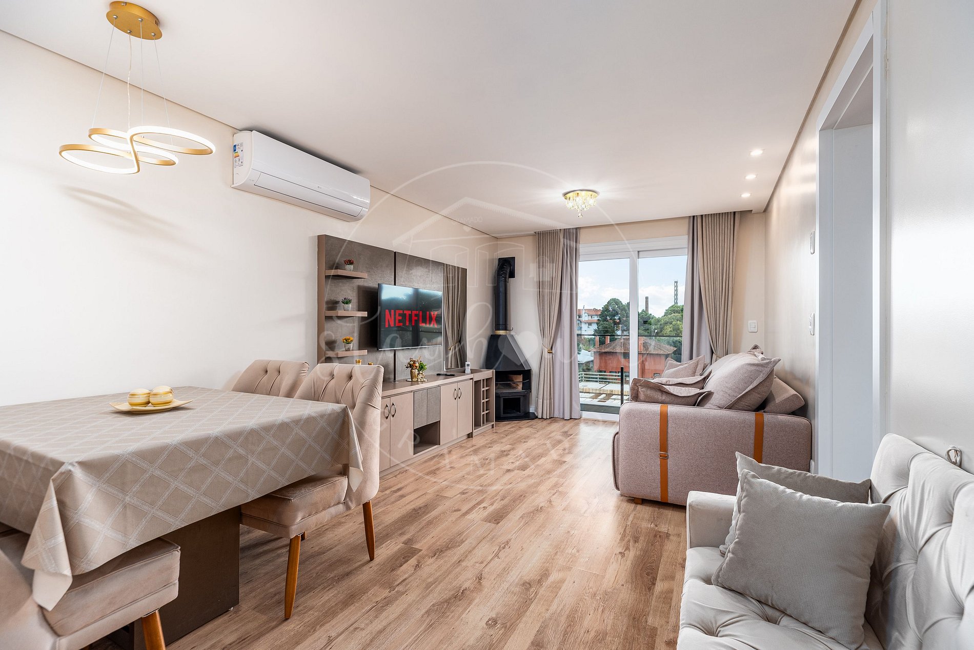 Sala e quartos com TV, e ar condicionados quente e frio