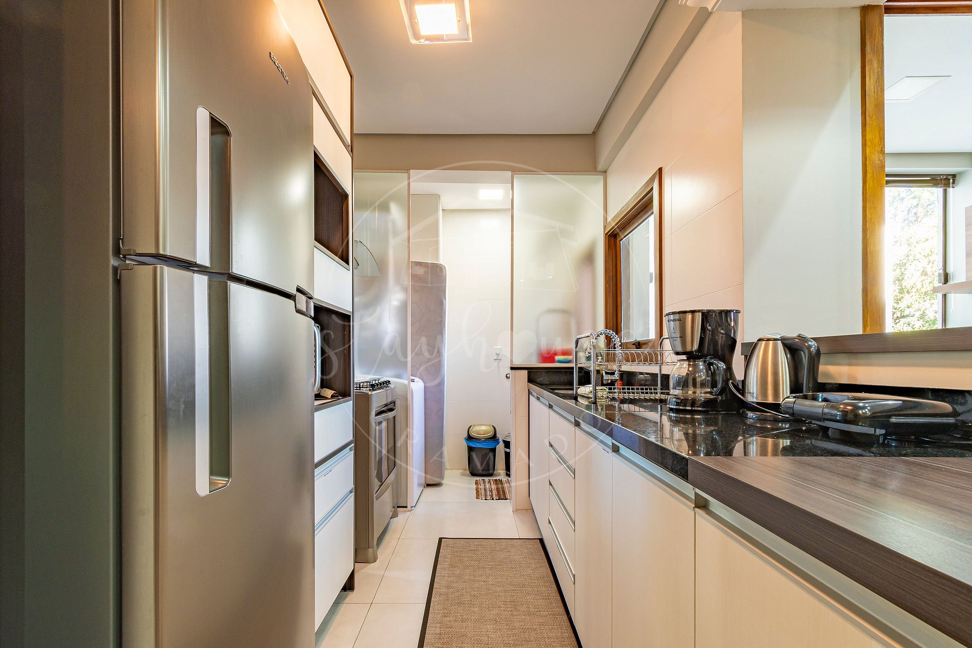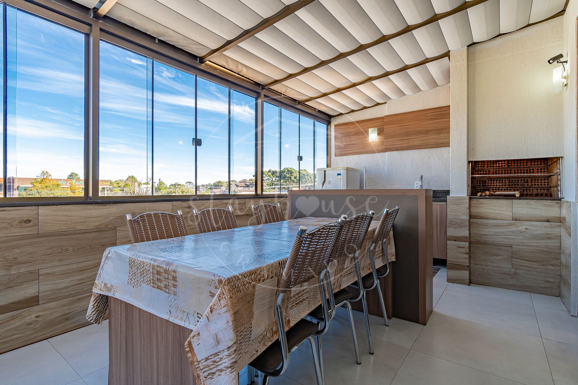 Sala de jantar com sacada com churrasqueira, ainda integrada ao ambiente a cozinha bem completa