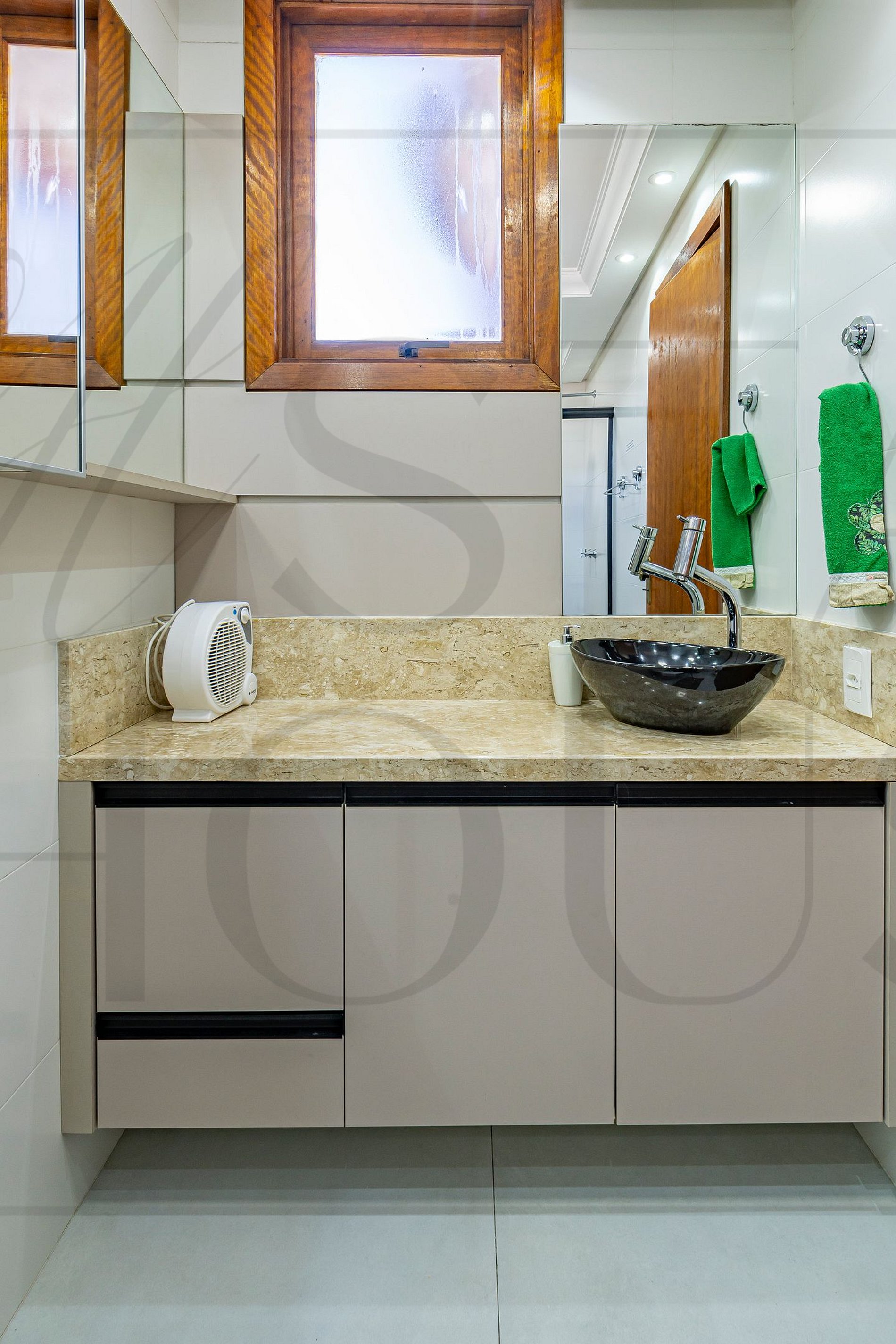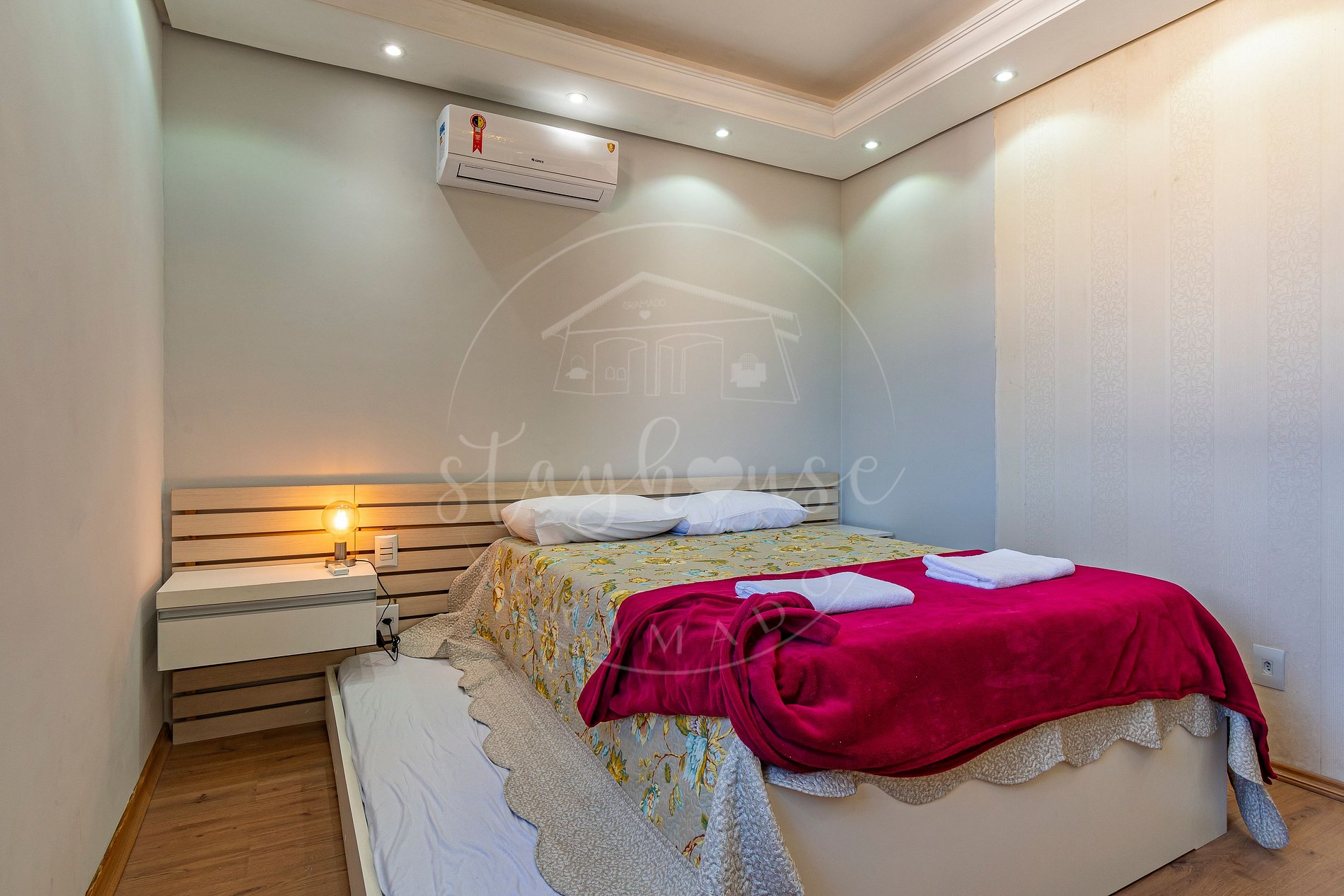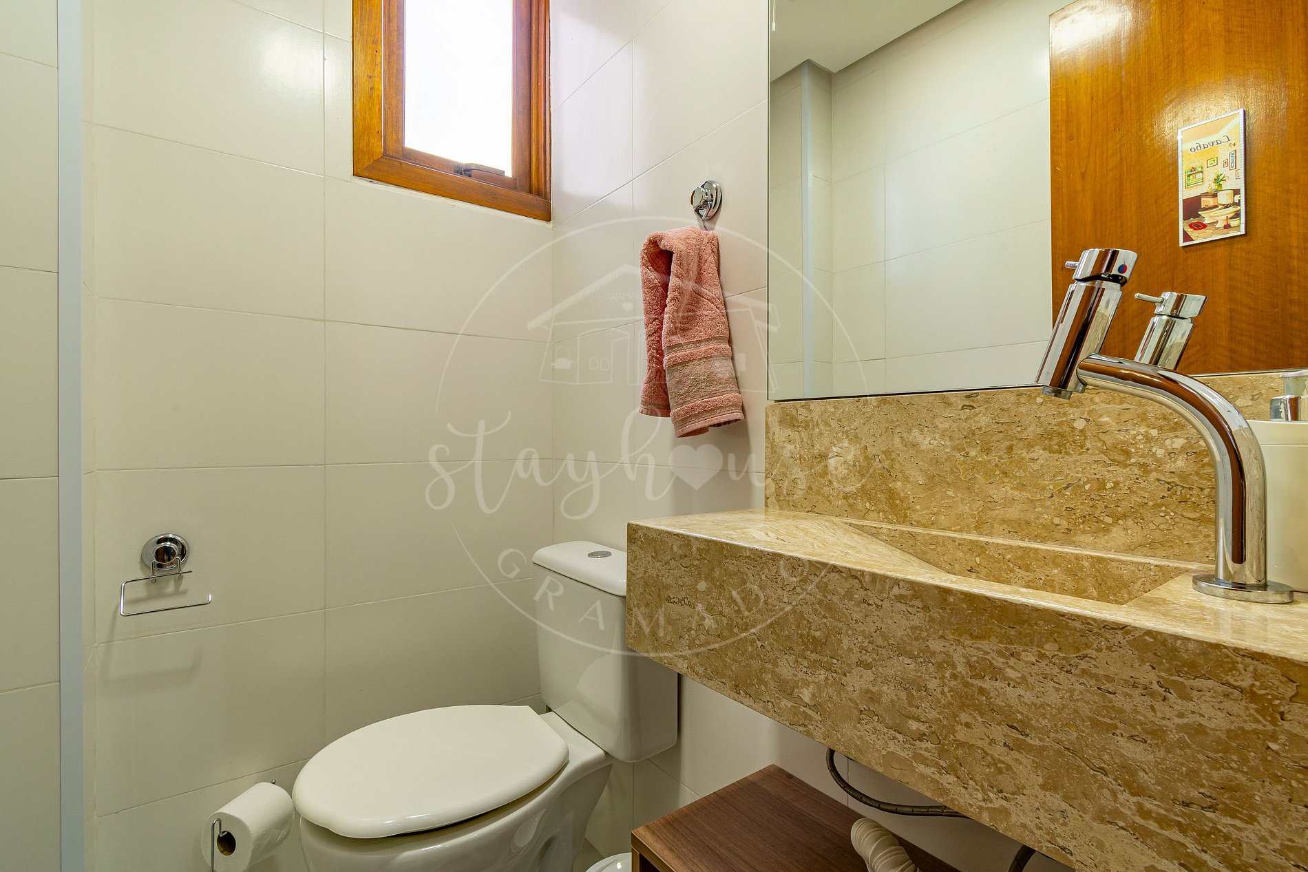 Um lavabo, e uma suite com cama queen e uma cama auxiliar de solteiro