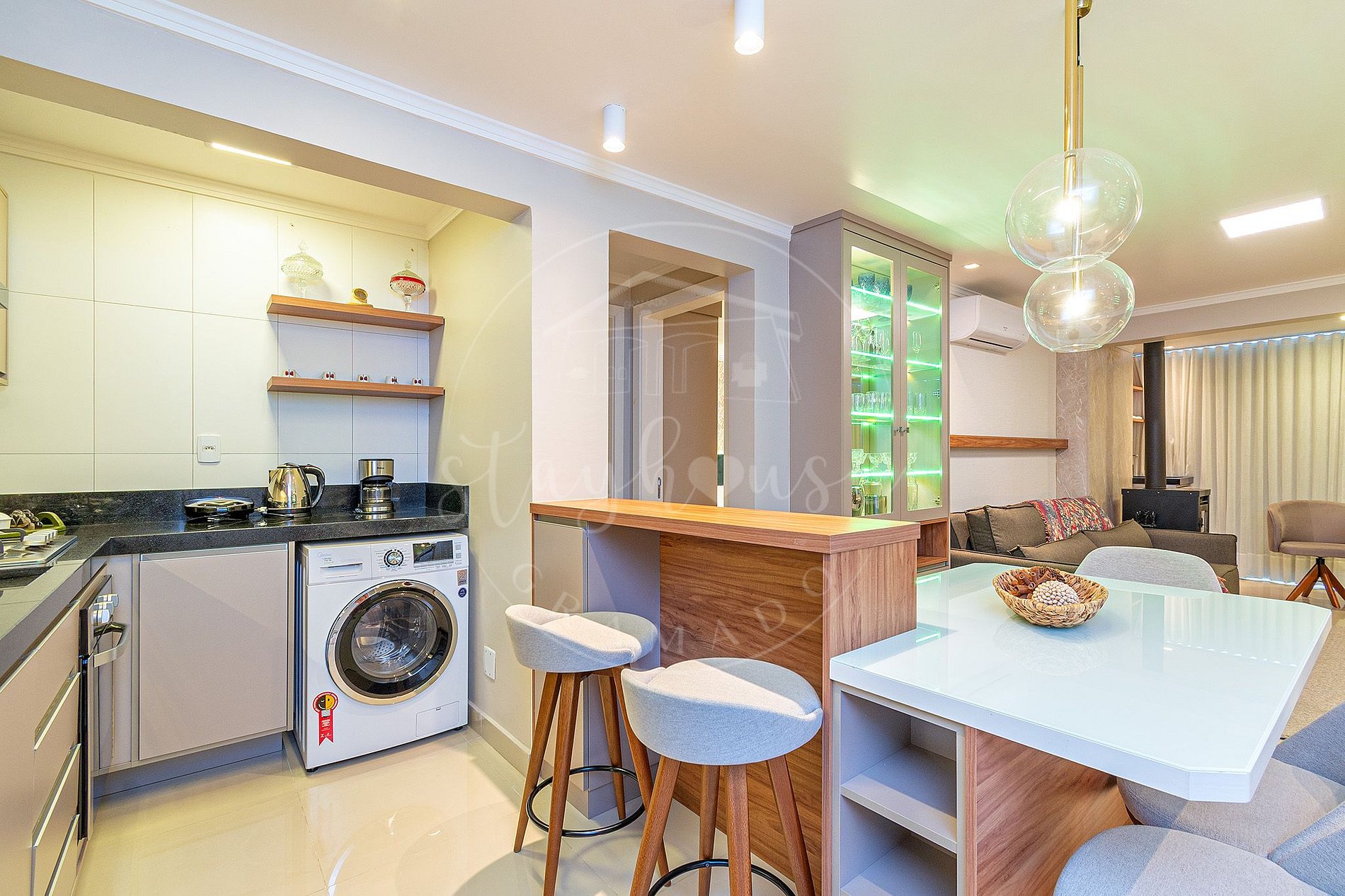 Cozinha completa e equipada, tanque e lava e seca.