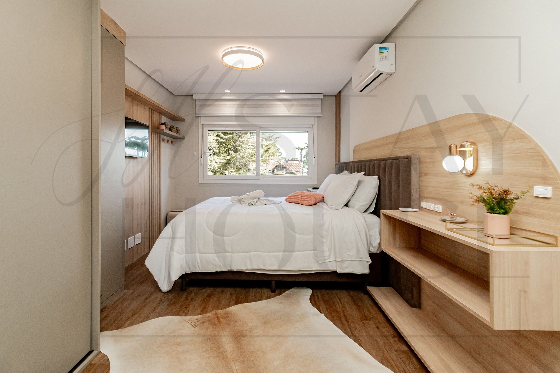 E no dormitório com cama casal, TV Smart, com estufa