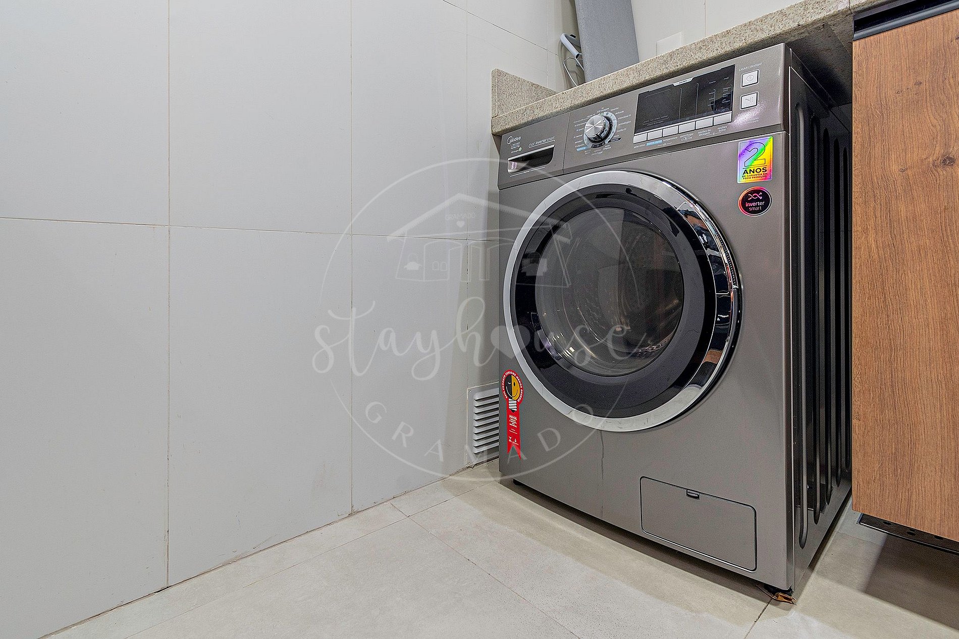 Na área de serviço com tanque, e lava e seca.