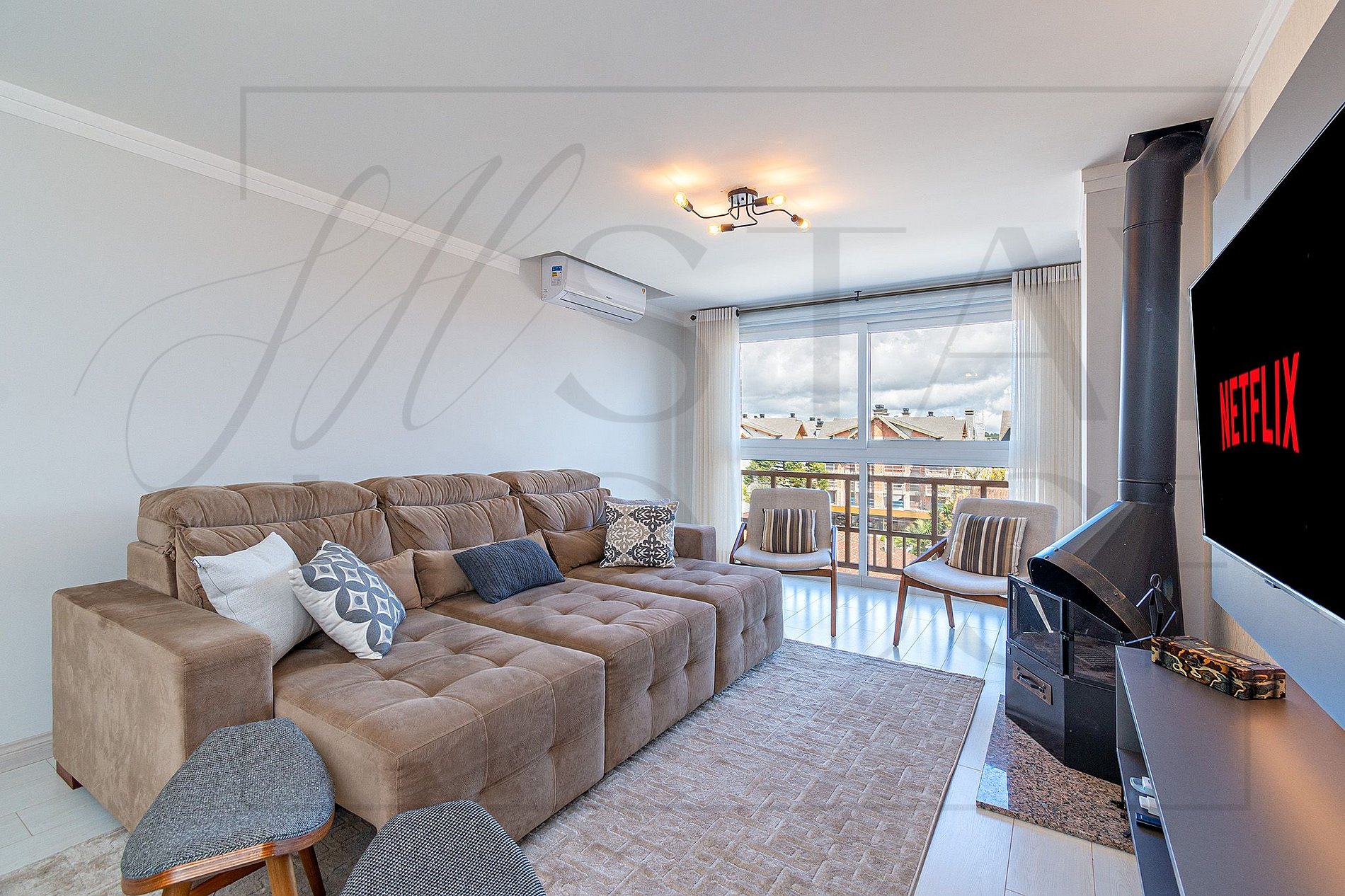TV Smart, com netflix e canais abertos. Uma lareira para os dias frios, que aquece bastante o ambiente, além dos ar split quente e frio na sala e dormitórios.