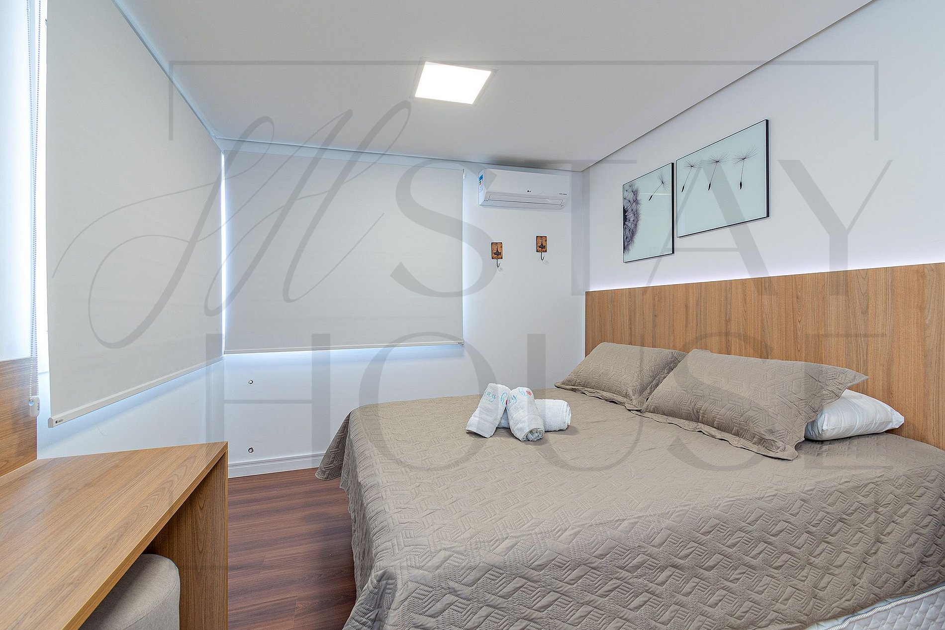 No dormitório tem uma cama queen, roupeiro. E ainda conta com um espaço para home office.