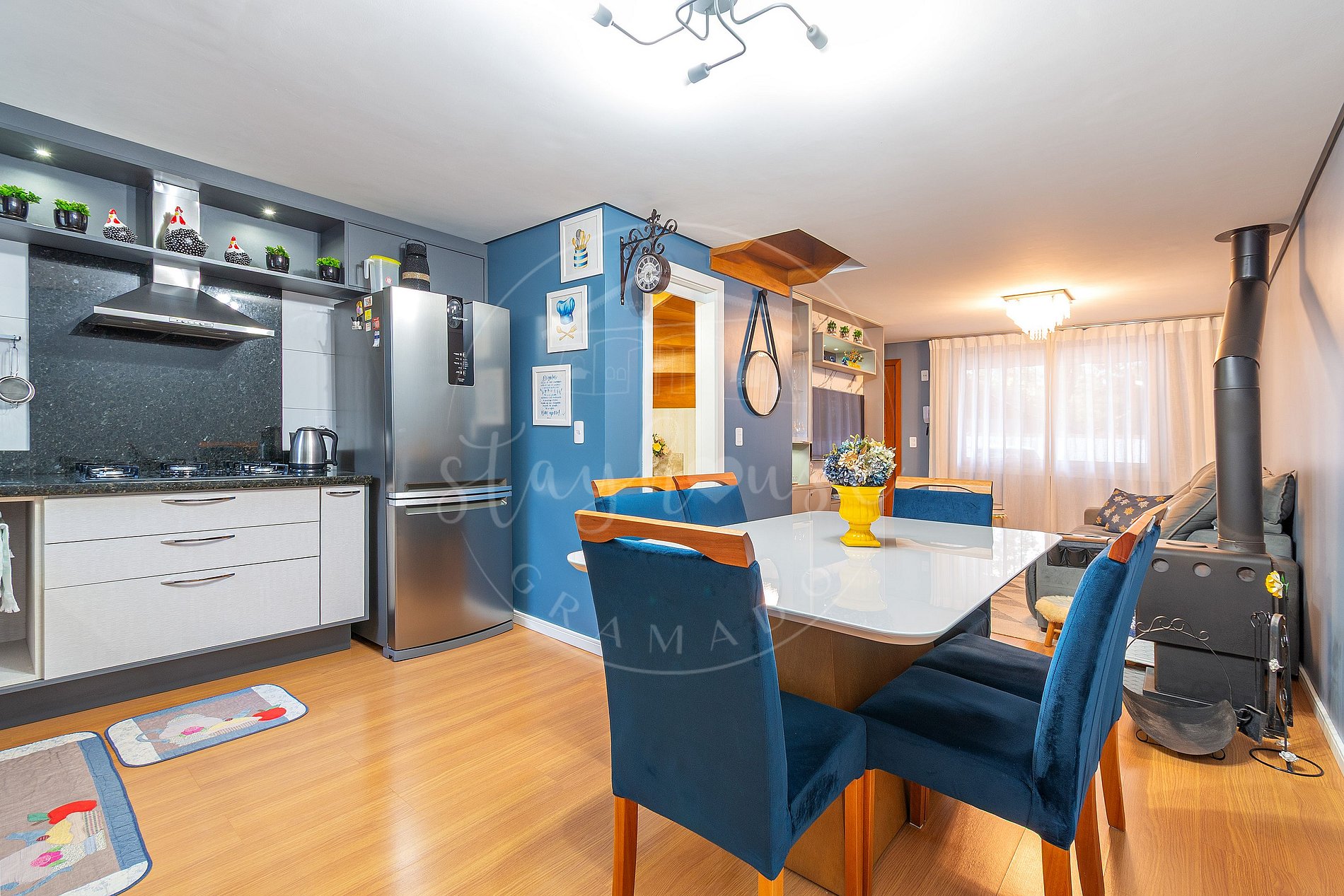 No andar térreo: sala aconchegante com calefator para aquecer o ambiente, TV smart, e mesa jantar para 6 pessoas, cozinha equipada.