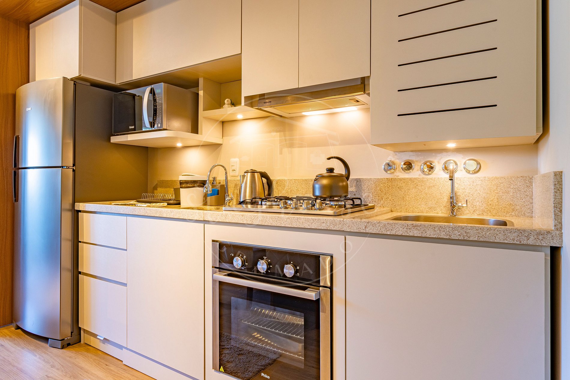 - Ele possui 1 suite com banheiro cama queen e cama auxiliar, e conta com mais 1 sofá cama casal, acomodando ao certo o total de 5 pessoas.