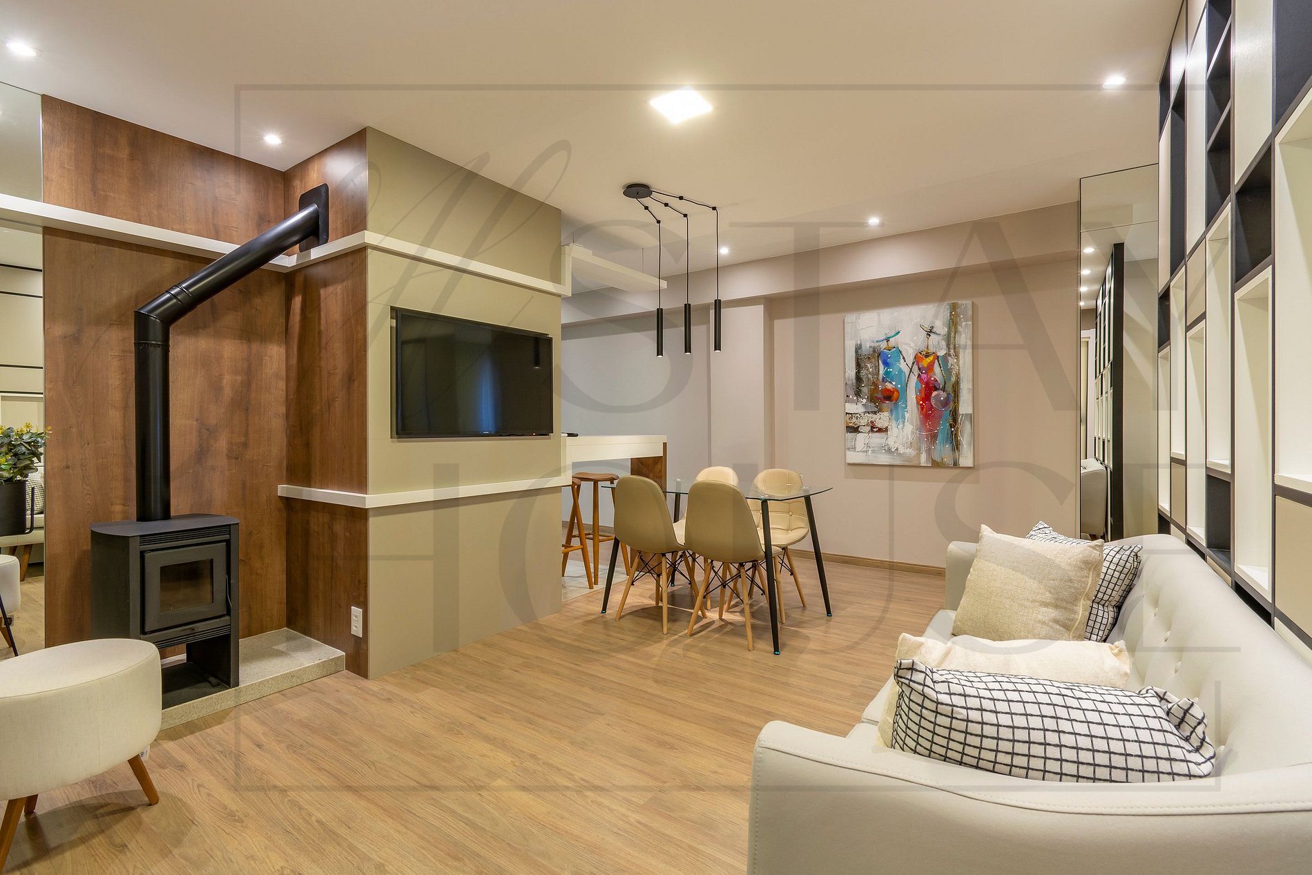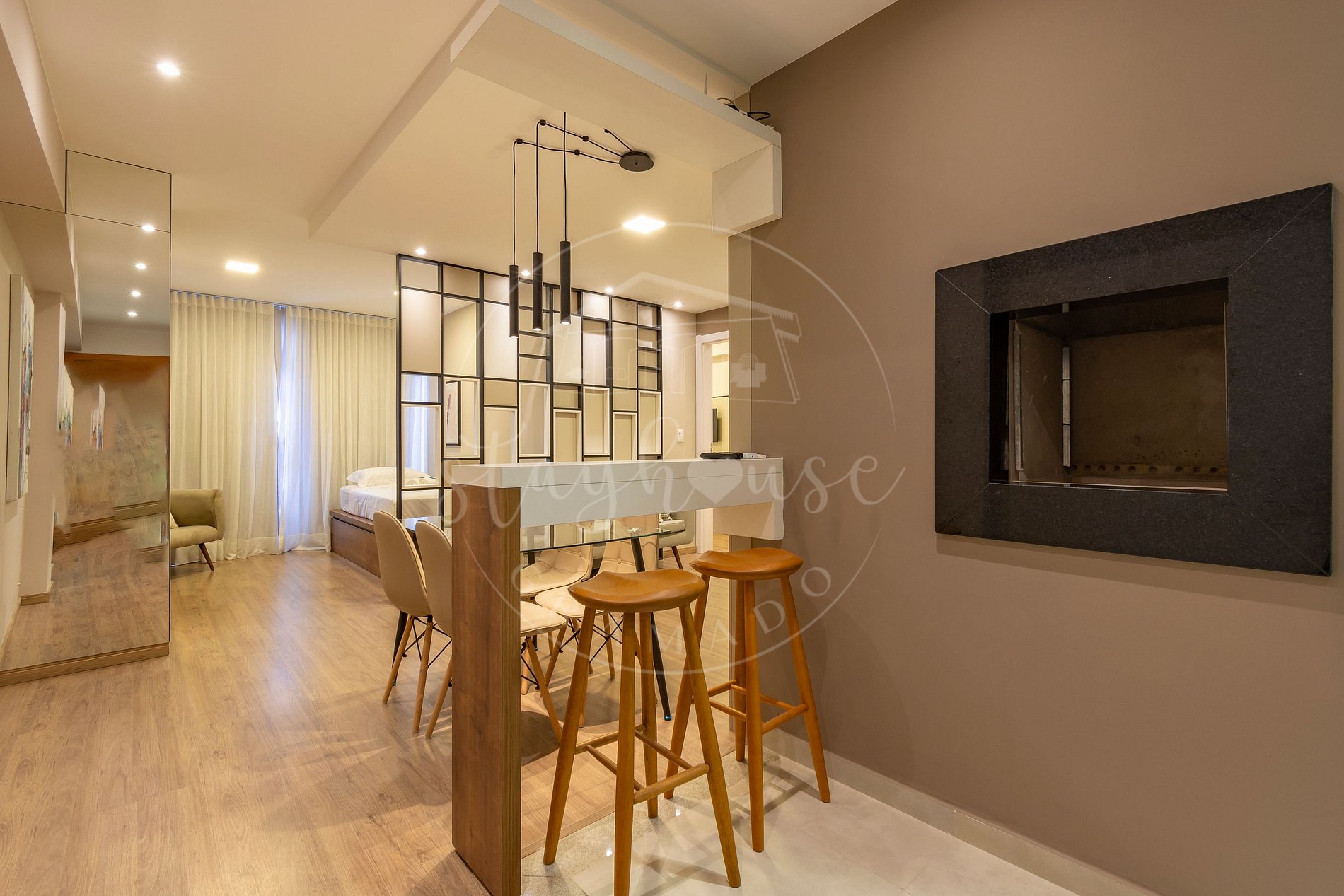 Ainda na sala tem uma bancada de apoio a churrasqueira com 2 banquetas.