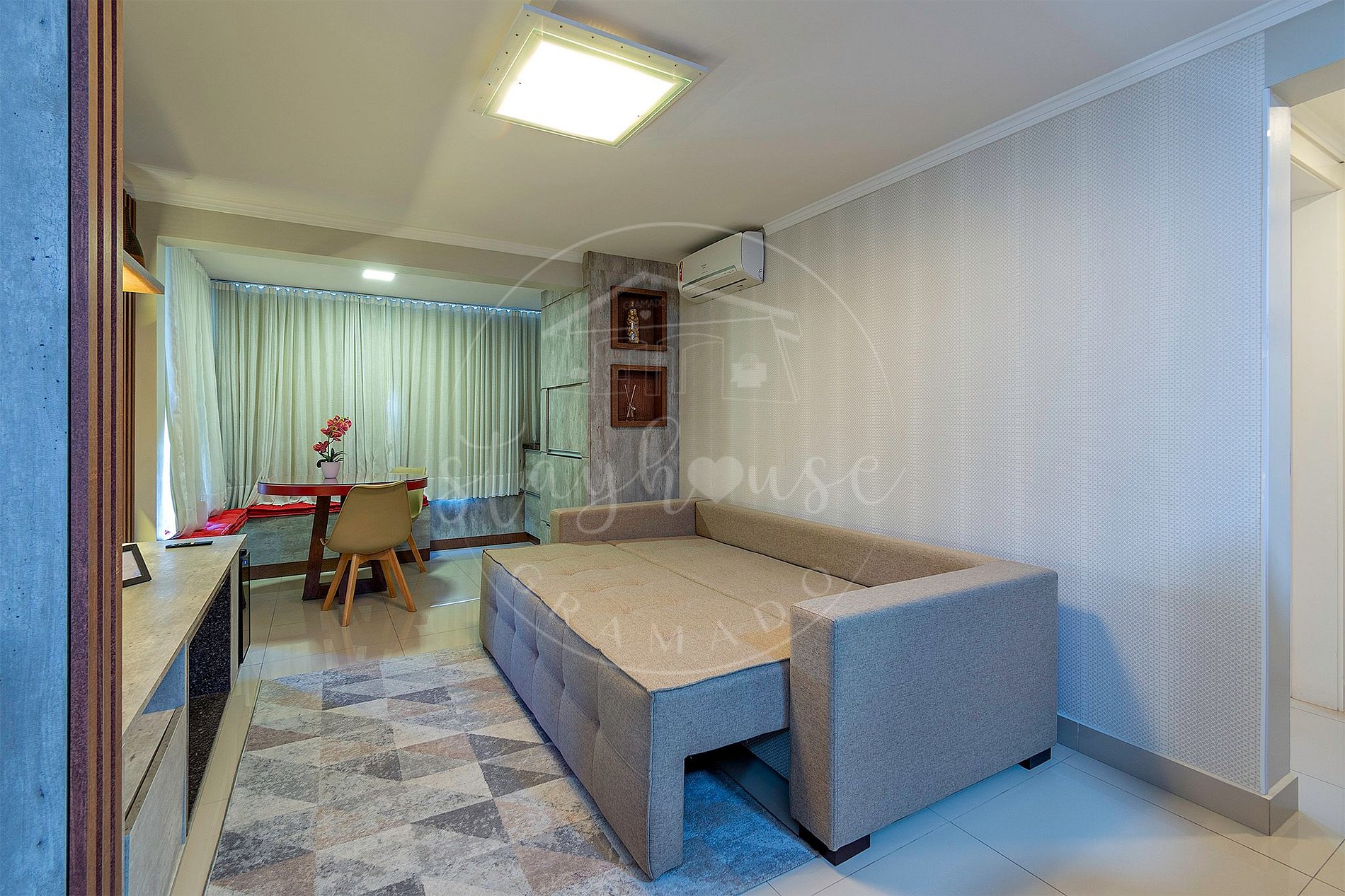 Sala de Estar: Conjugado com jantar, TV Smart, sofá cama casal (2 pessoas) + ar split quente e frio