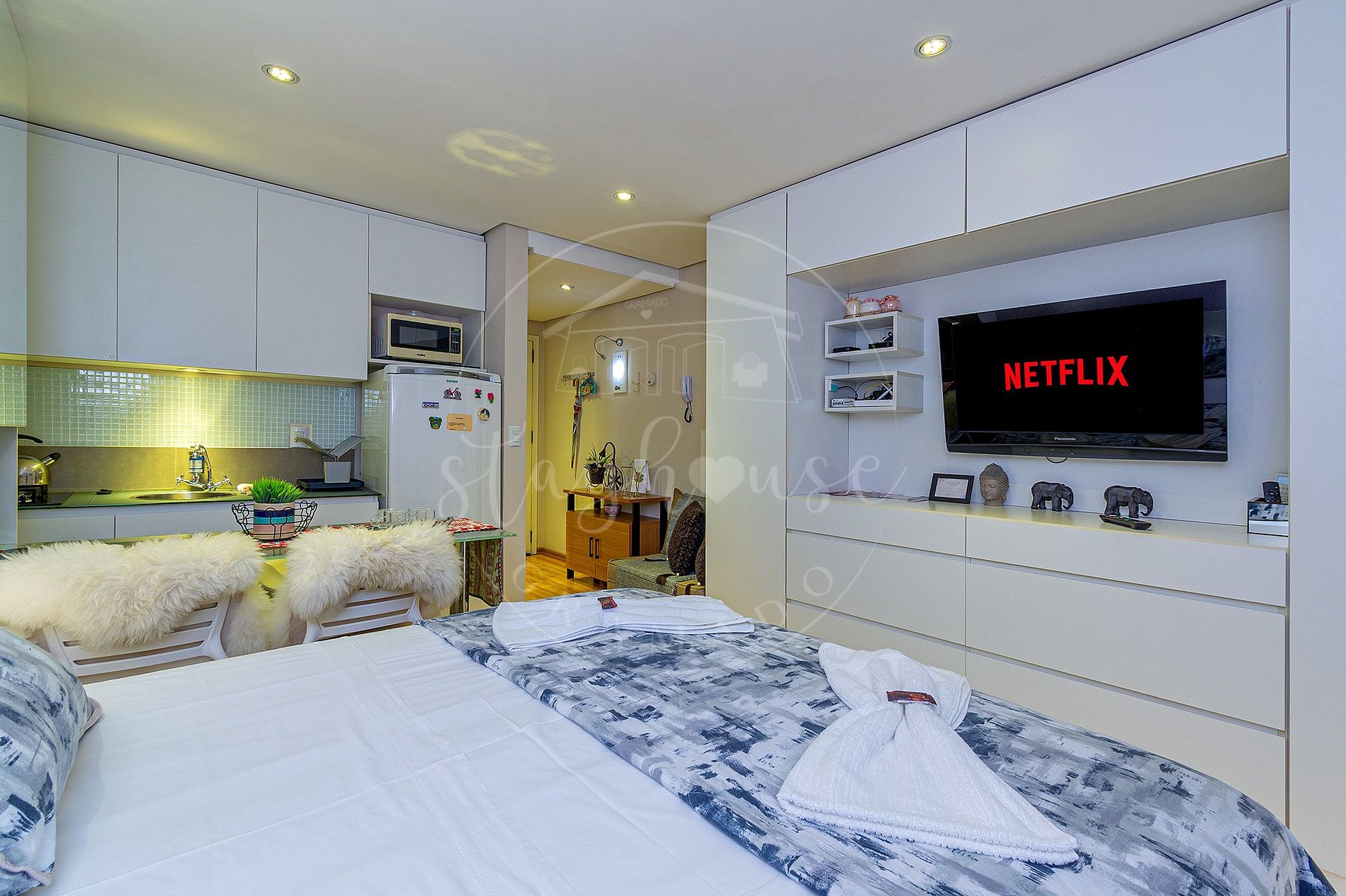 Studio funcional quarto e cozinha integrados com ar condicionado, e um banheiro social com tudo que nosso hóspede necessita para sua hospedagem.