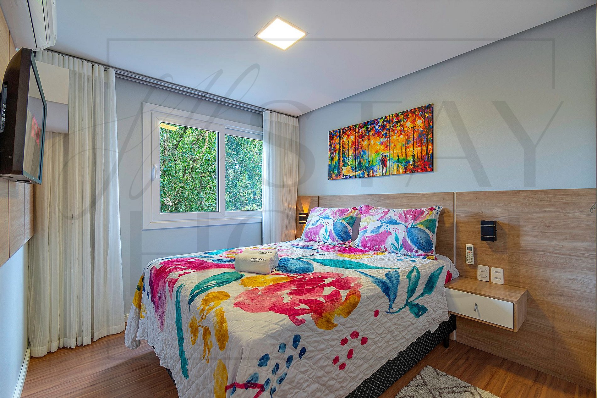 São 4 suítes com Tv, cama queen e ar condicionado quente e frio