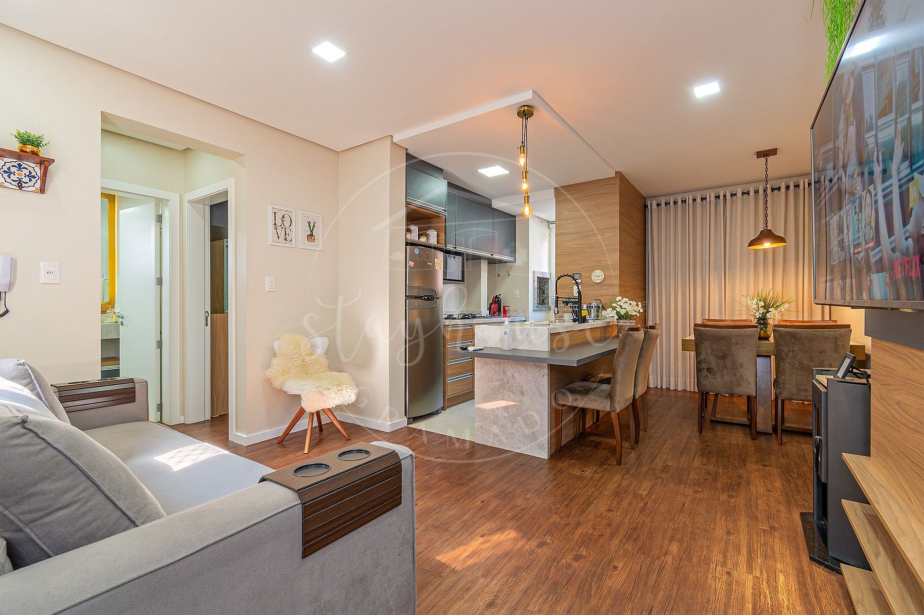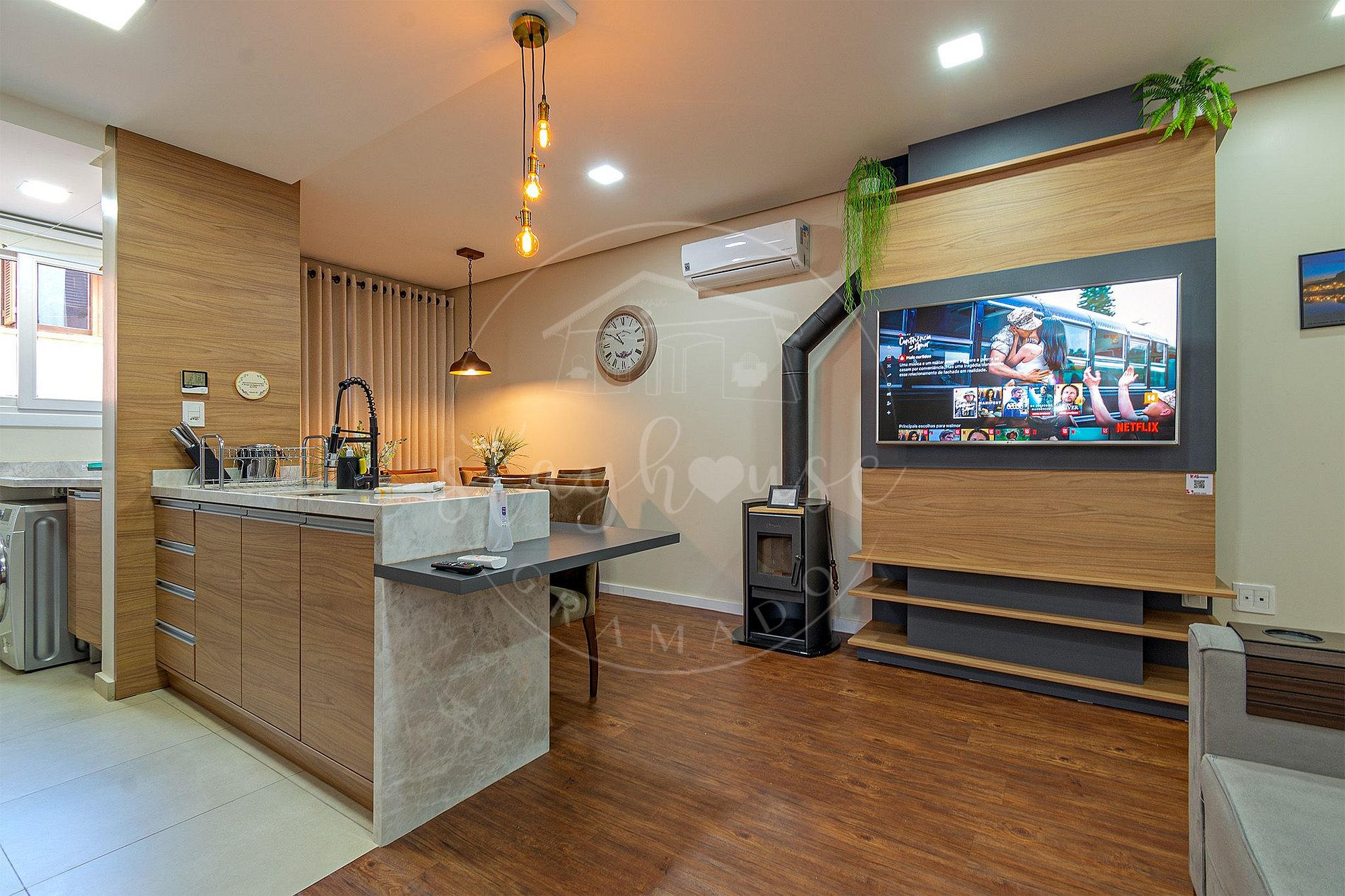 Cozinha mobiliada equipada, ambiente de estar e jantar integrado com lareira, WI FI, TV SMART, 1 vaga de garagem, não sendo necessário carro por ser muito próximo a Catedral de Pedra e demais estabelecimentos comerciais.