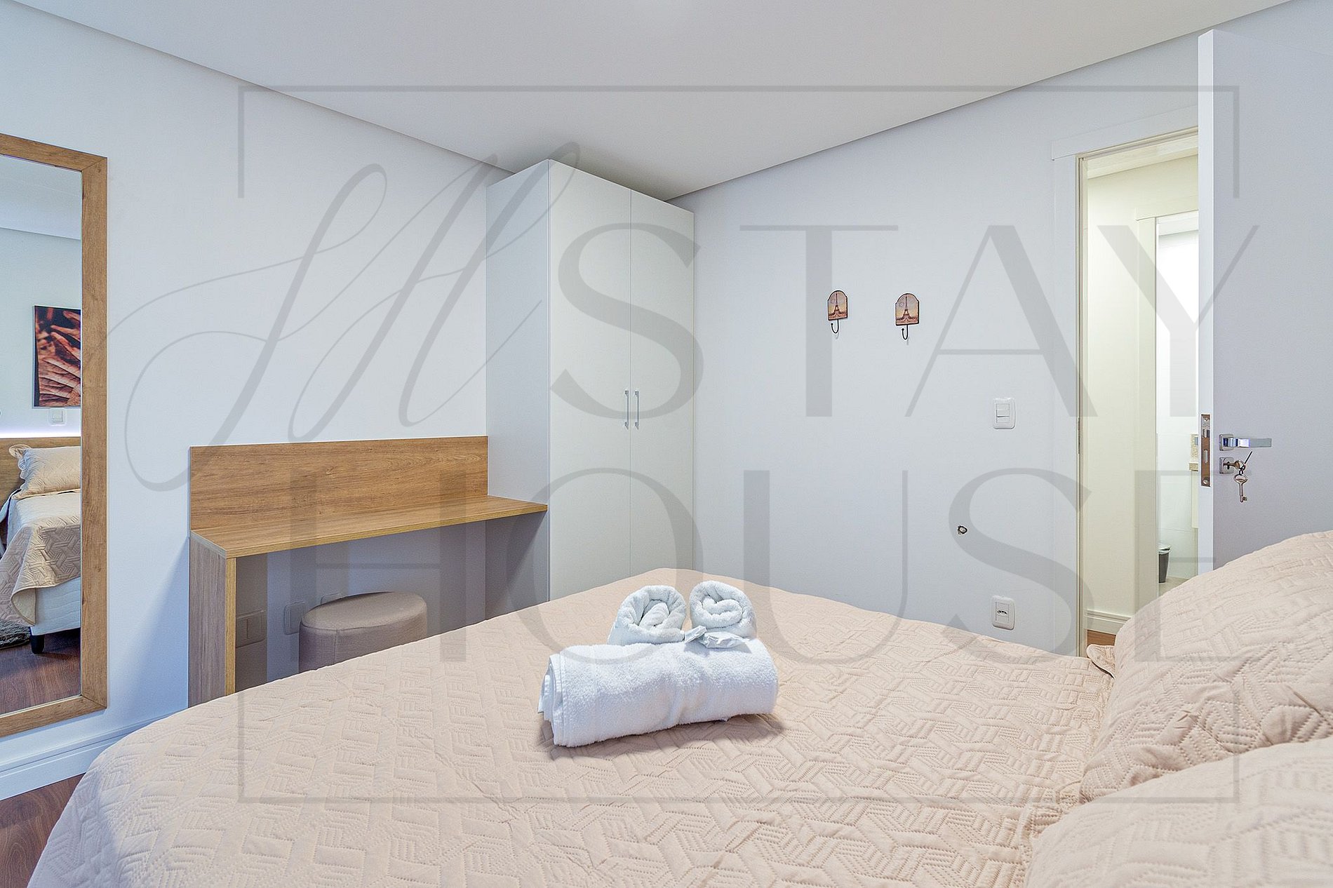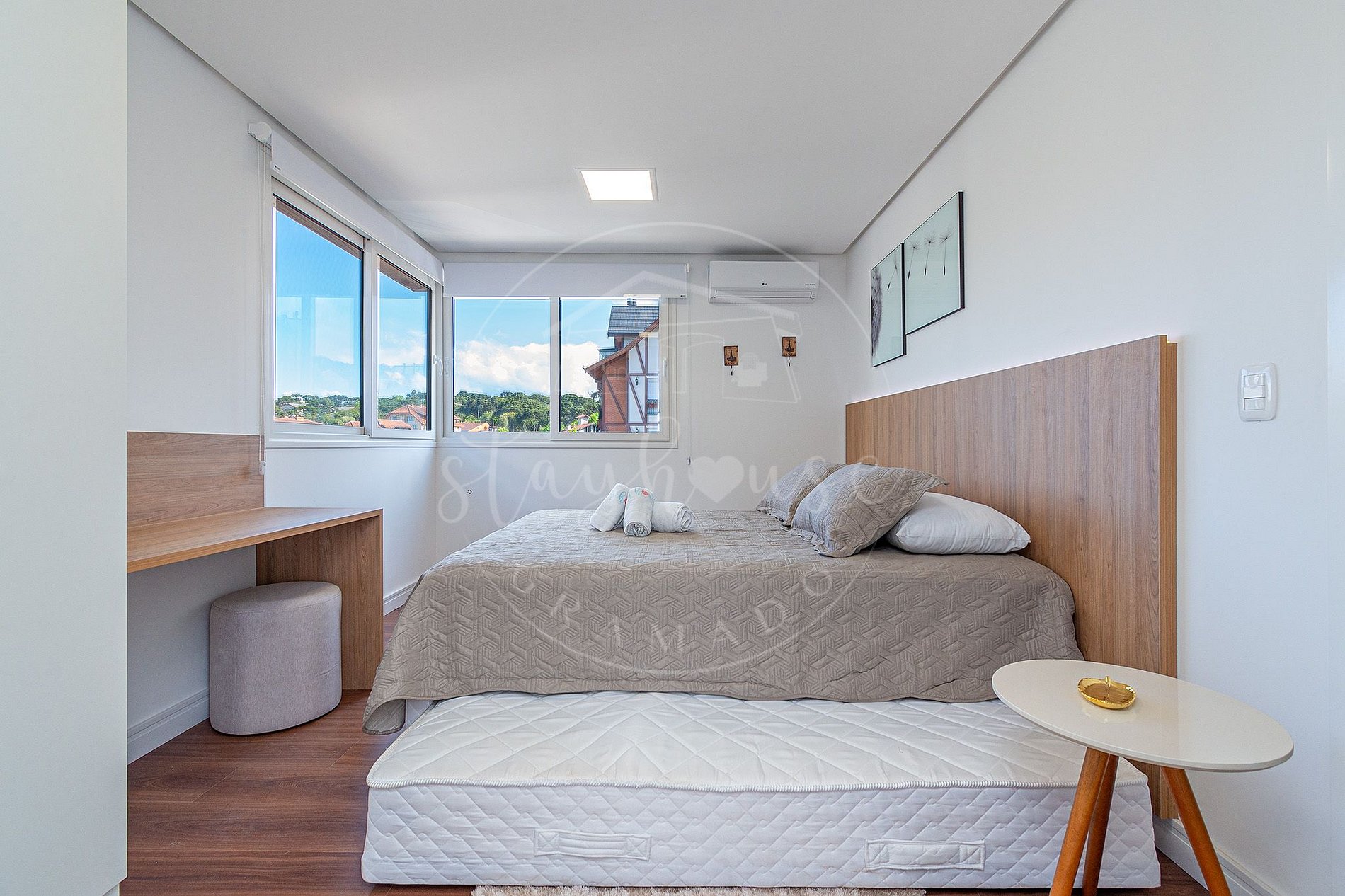 No dormitório tem uma cama queen, roupeiro. E ainda conta com um espaço para home office.