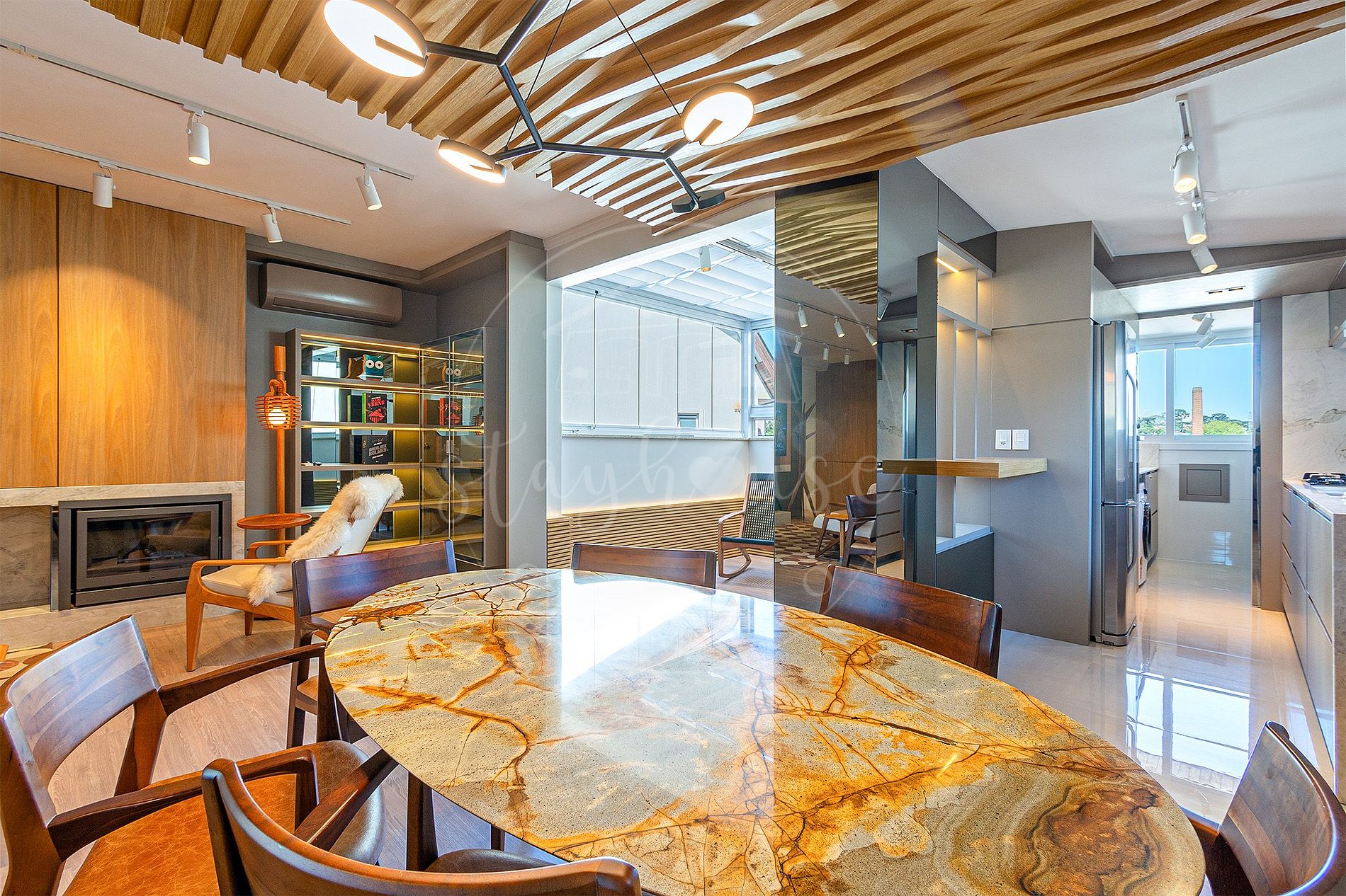 Na sala um sofá confortável e poltronas, com lareira e decoração refinada, além de um spli quente e frio. Na sacada integrada contamos com uma cadeira para uma leitura e descanso.