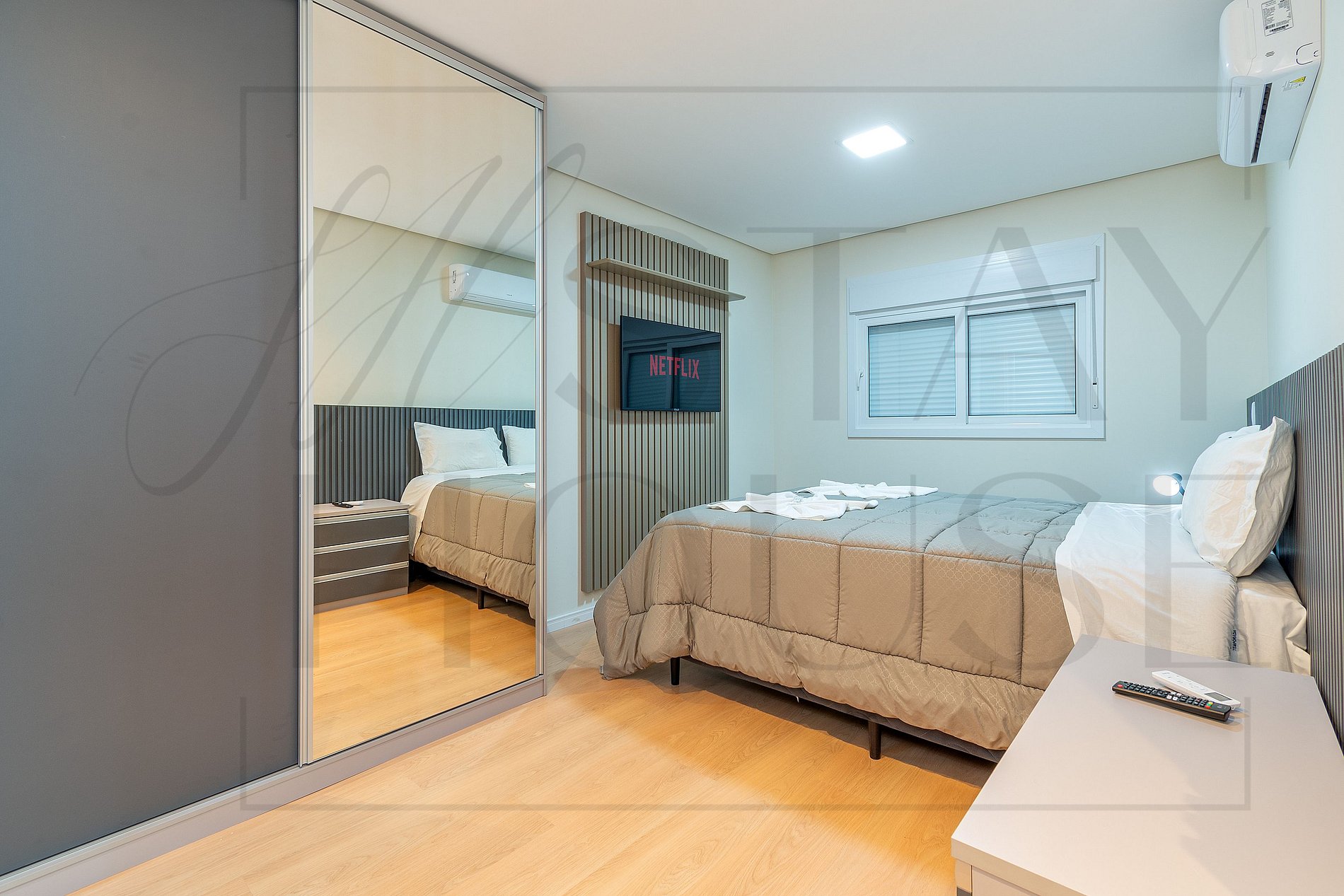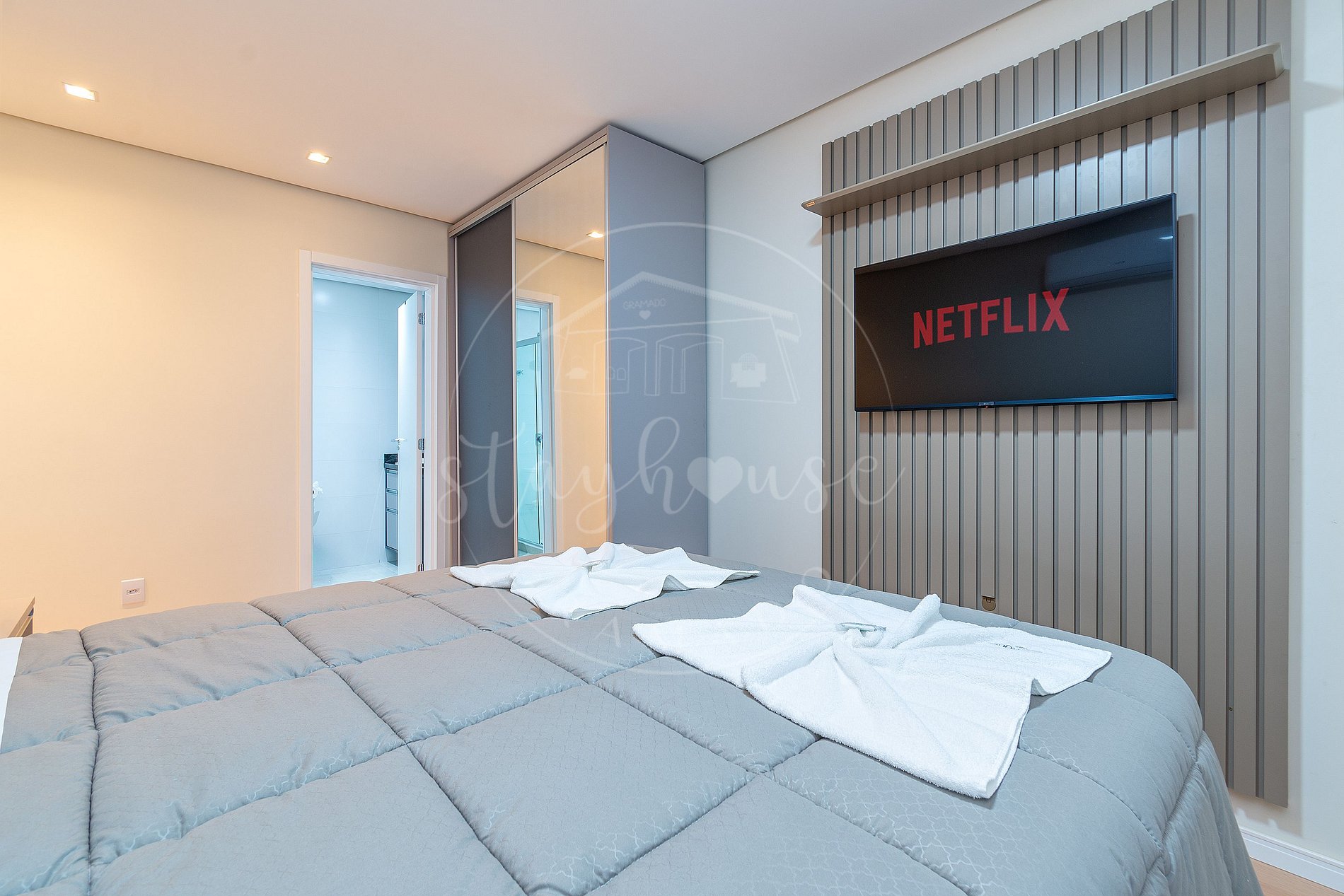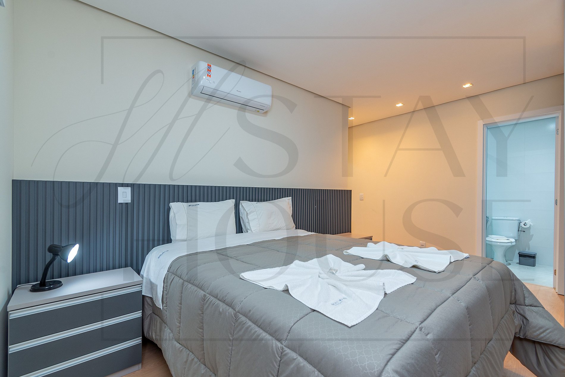 SUÍTE com cama queen, TV Smart, ar split quente e frio e roupeiro.