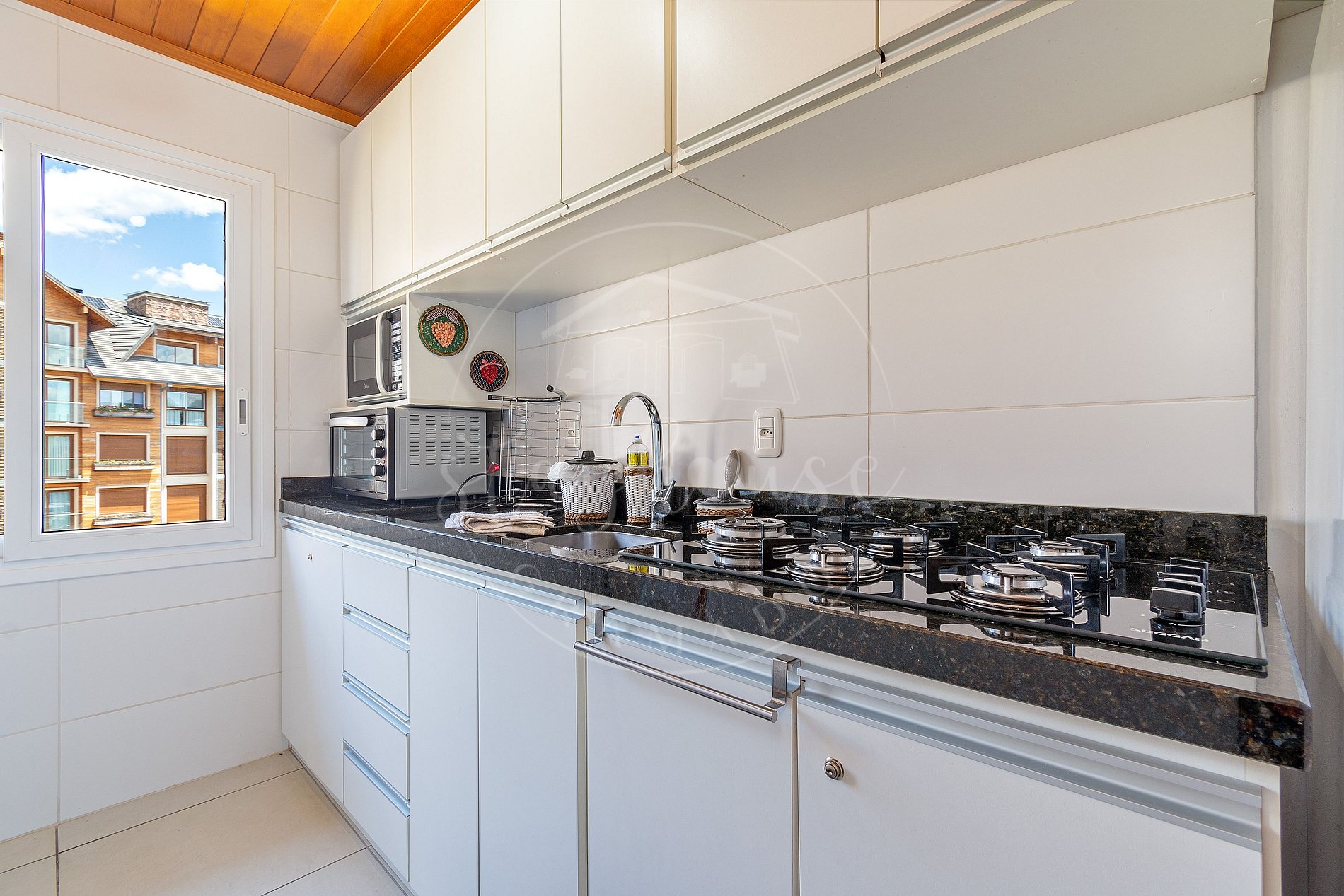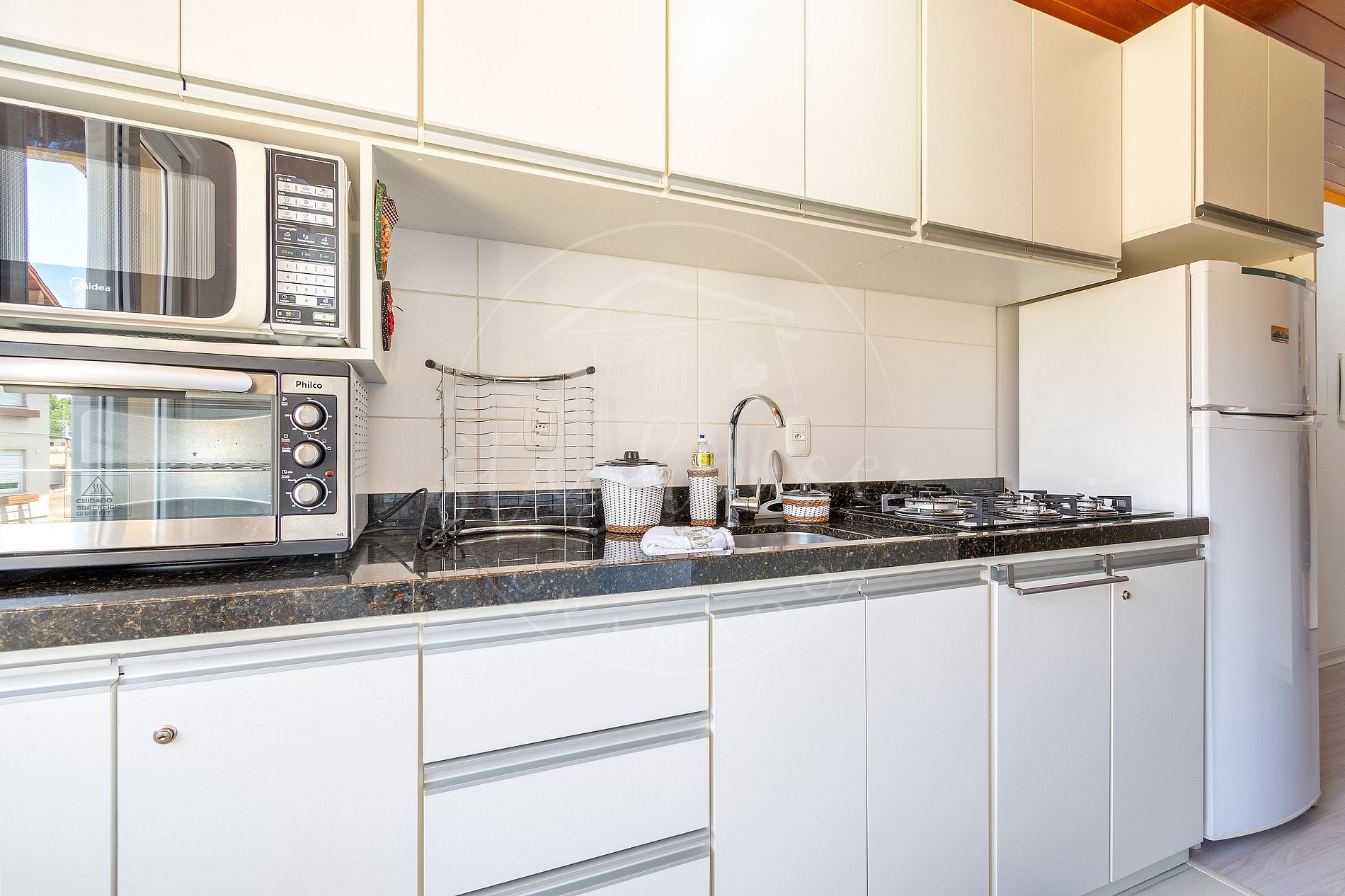Na cozinha super equipada, contamos com todos os eletrodomésticos necessários para sua hospedagem, cafeteira, sanduicheira, fogão com forno, e churrasqueira na cozinha.