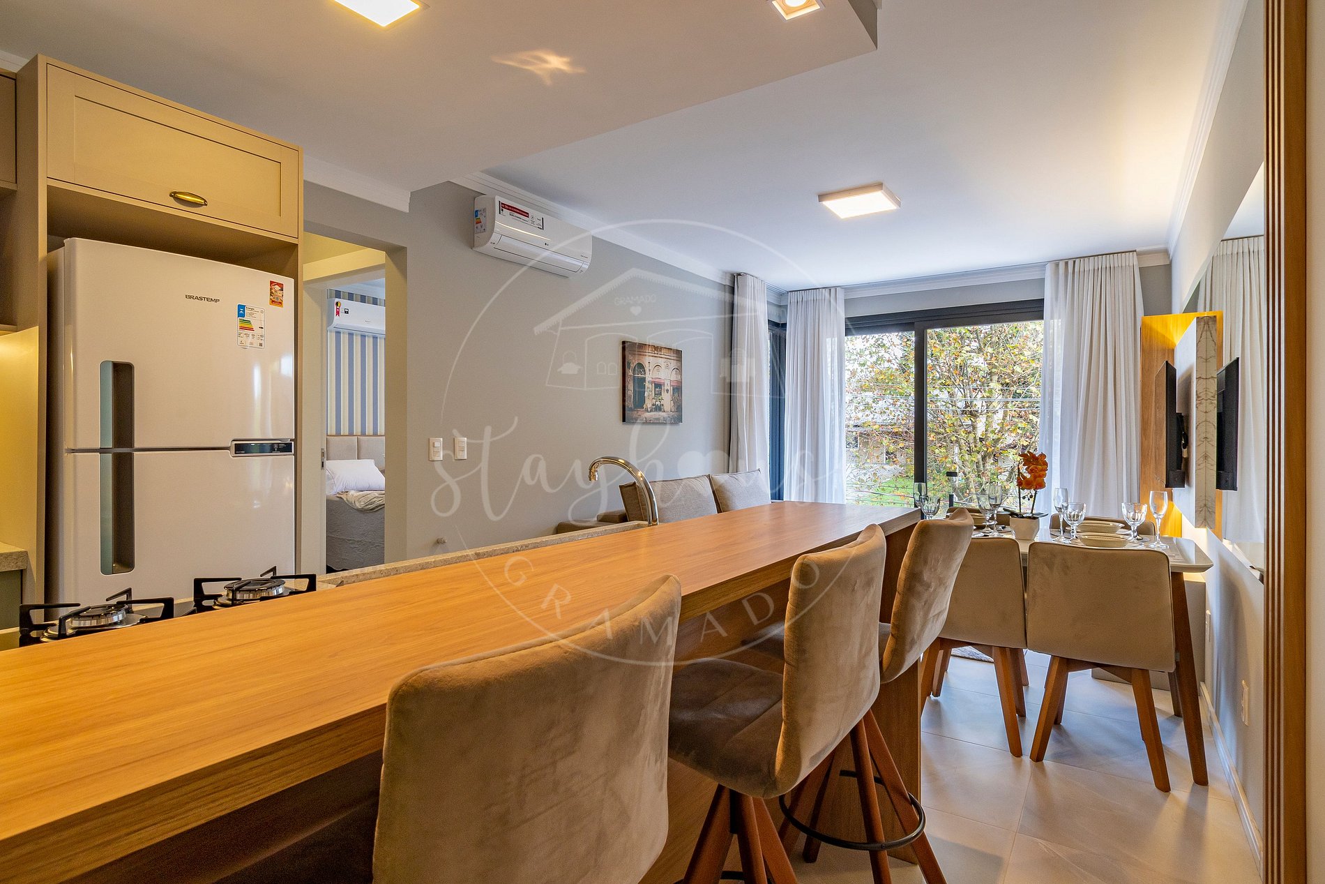 Imóvel conta com sala de estar e jantar com TV smart e um confortável sofá cama casal na sala. Além de uma mesa redondo acomodando 4 pessoas, e mas uma bancada acomodando mais 2 pessoas