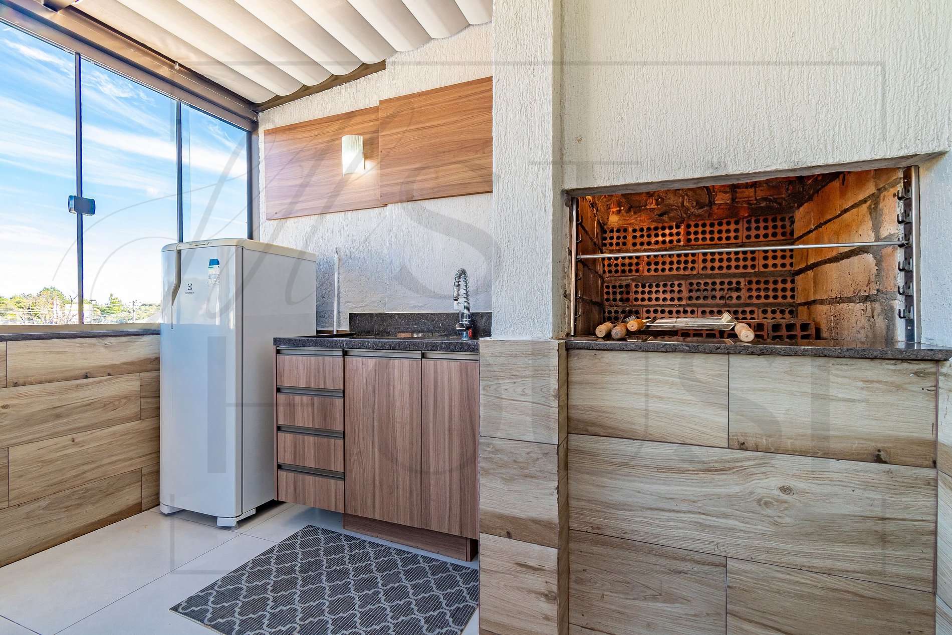 Sala de jantar com sacada com churrasqueira, ainda integrada ao ambiente a cozinha bem completa