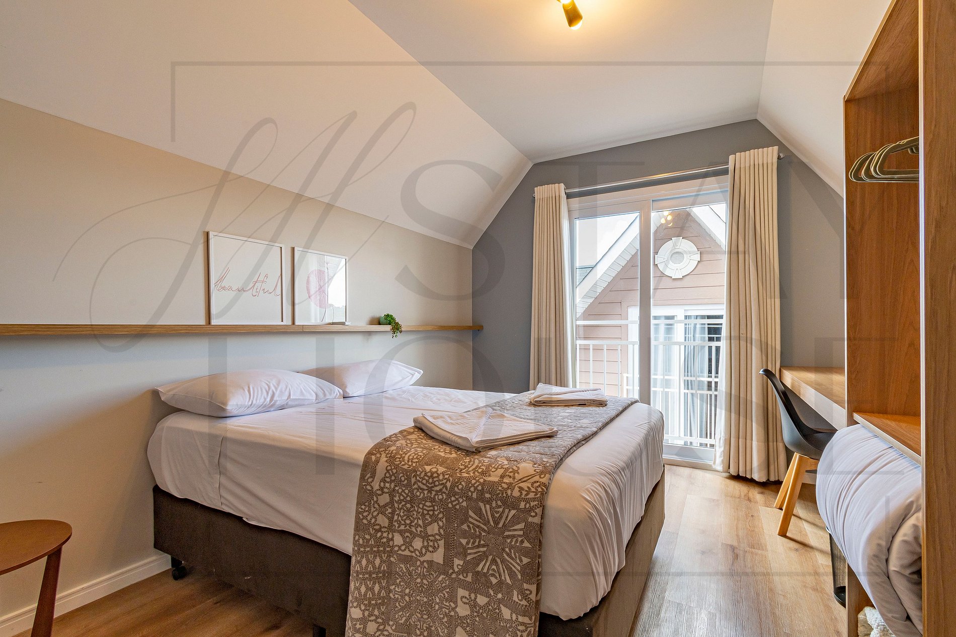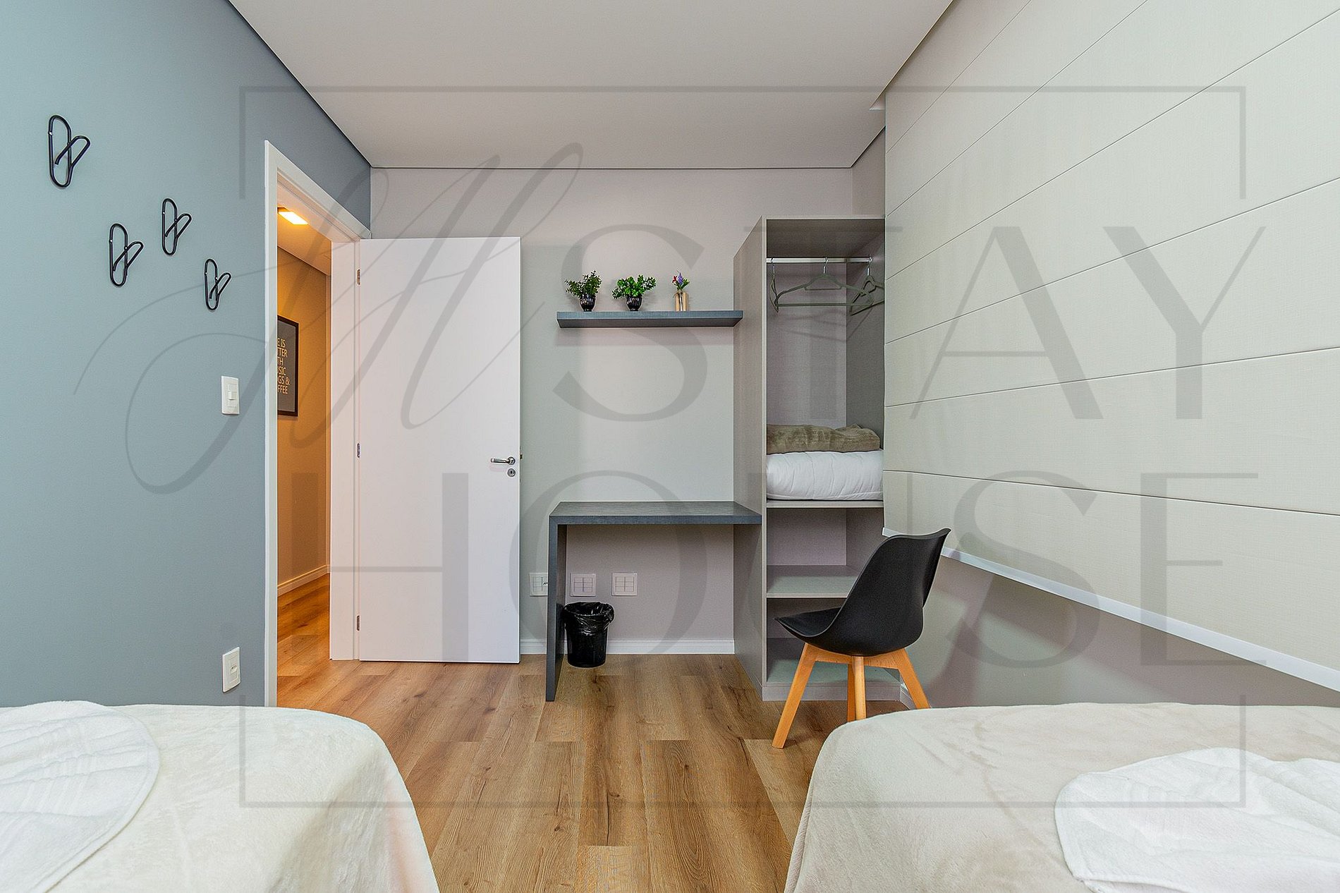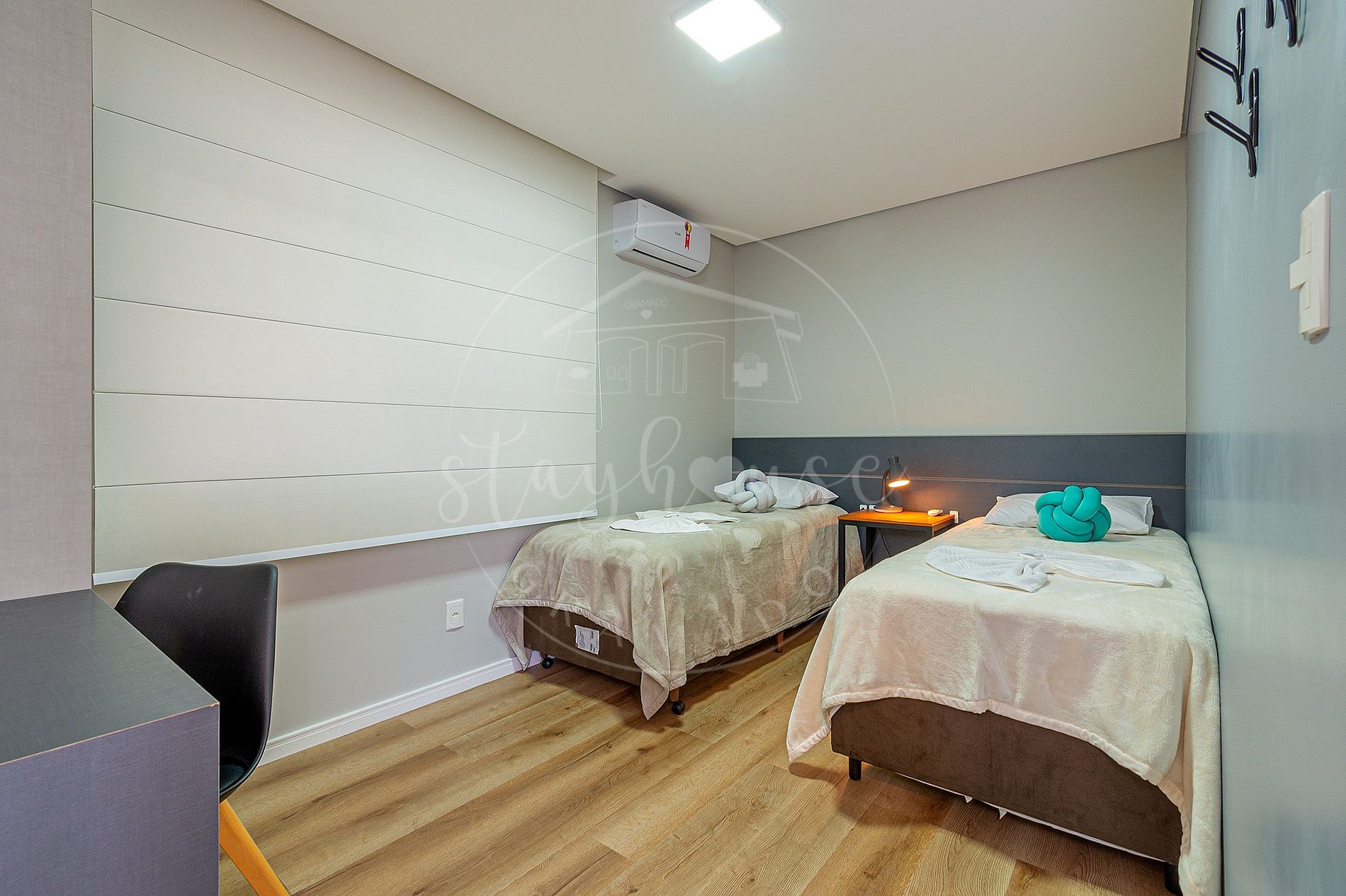 Além de um dormitório com duas camas de solteiros que podem ser unidas se transformando em casal, e uma bancada de estudos.