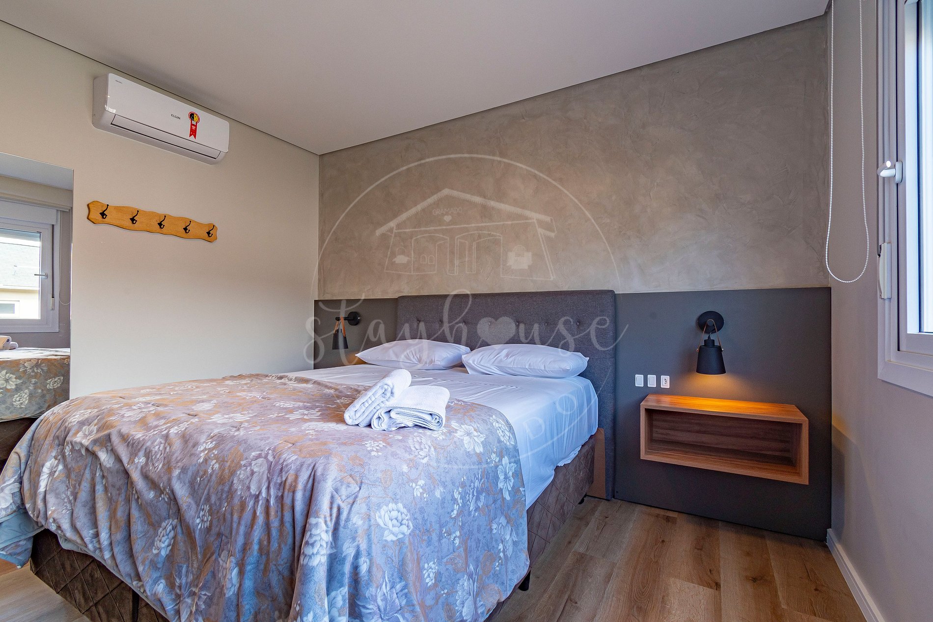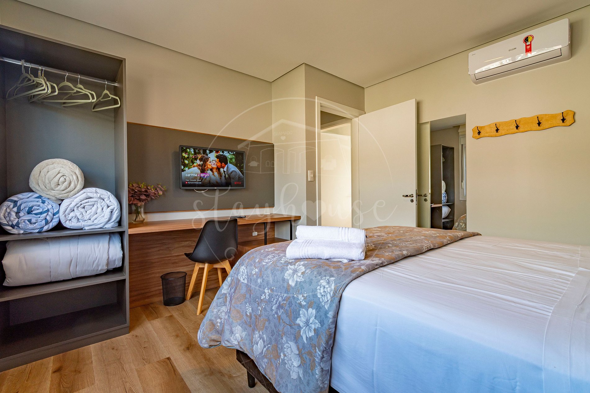Todos os cômodos (sala e dormitórios) tem ar quente e frio. Os roupeiros tem o conceito aberto.