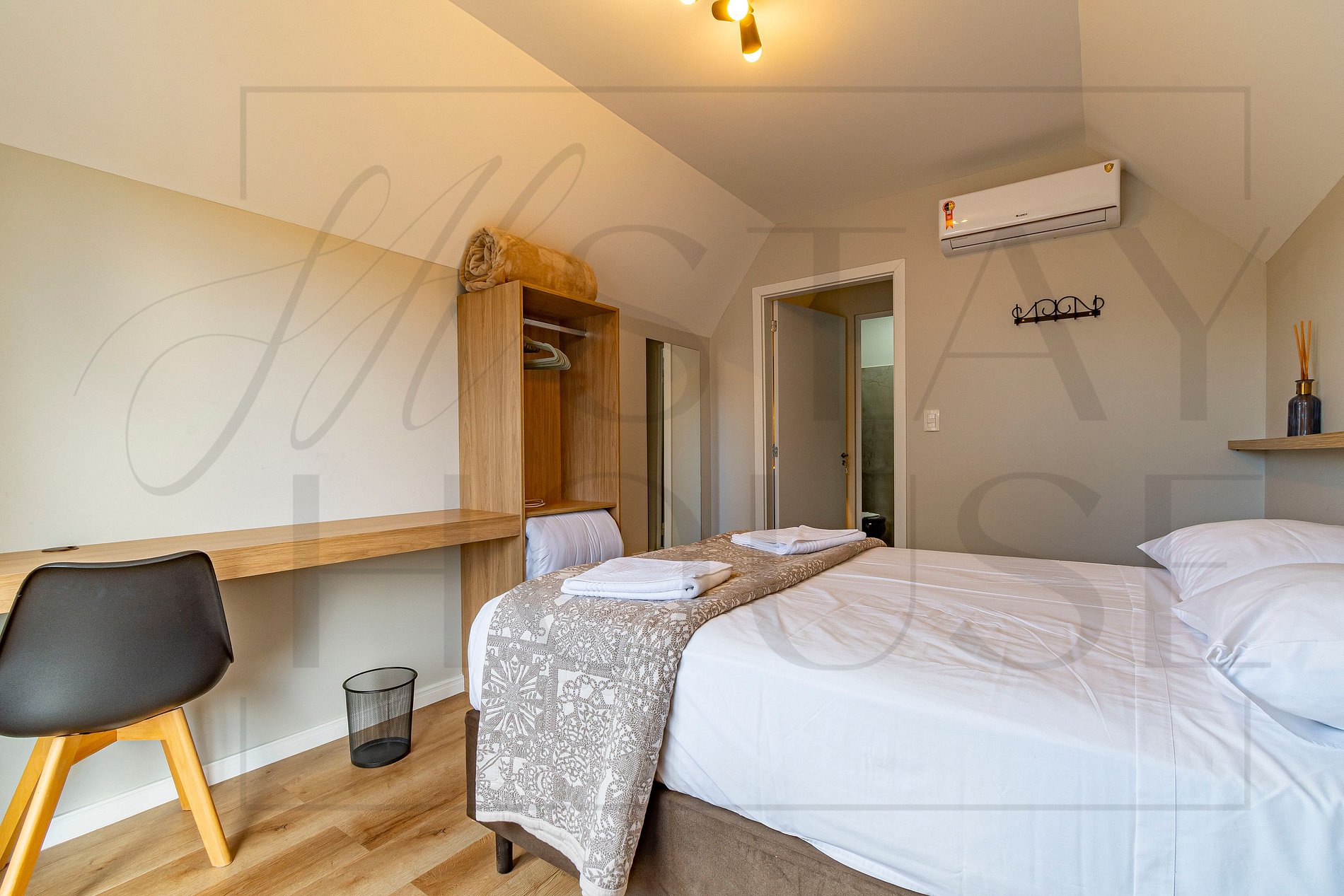 - Terceiro pavimento um banheiro completo, no dormitório uma cama casal e uma bancada de estudos.