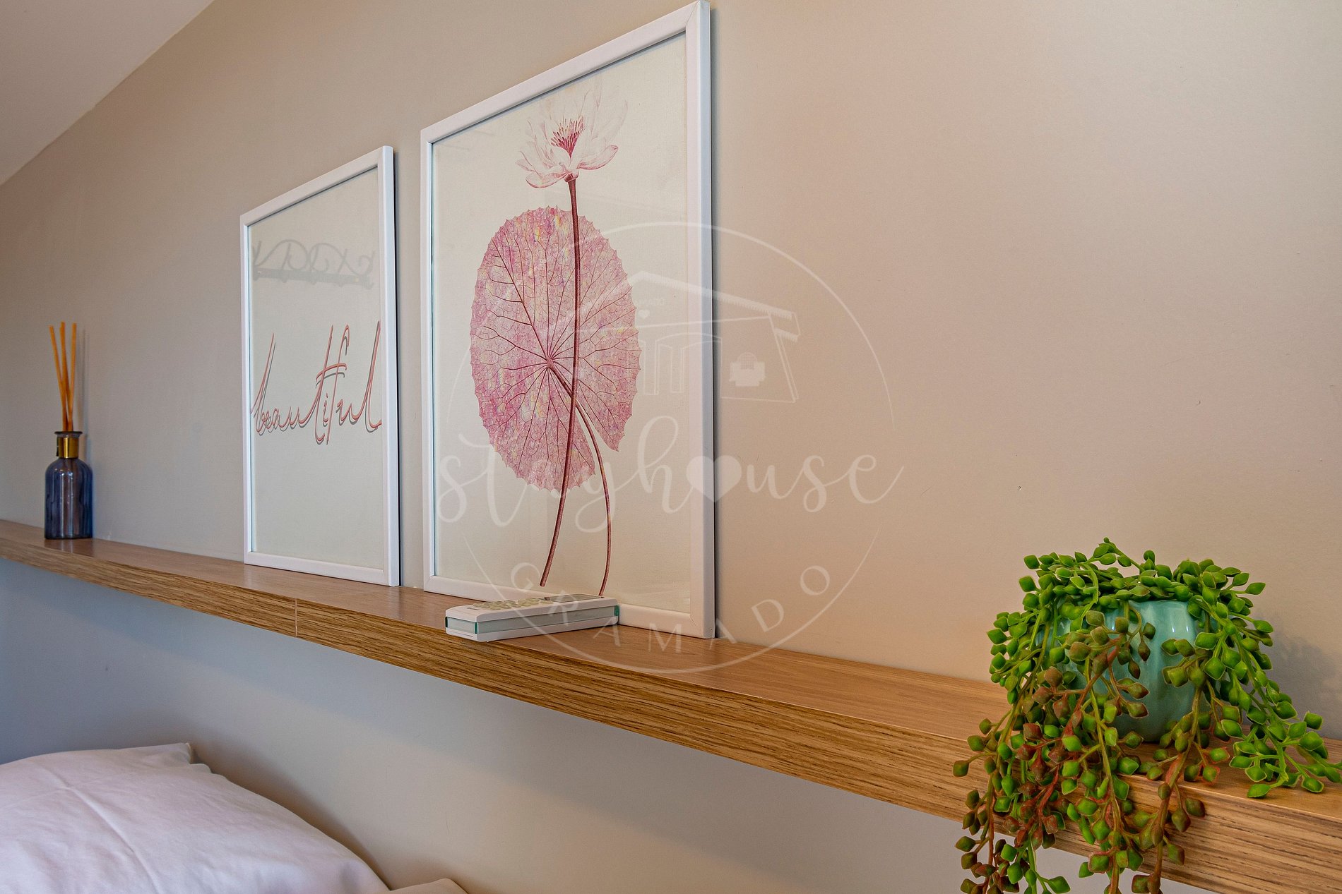 No segundo pavimento um banheiro social, um dormitório com cama queen e espaço para home office ou estudos. Dormitório casal com TV Smart.