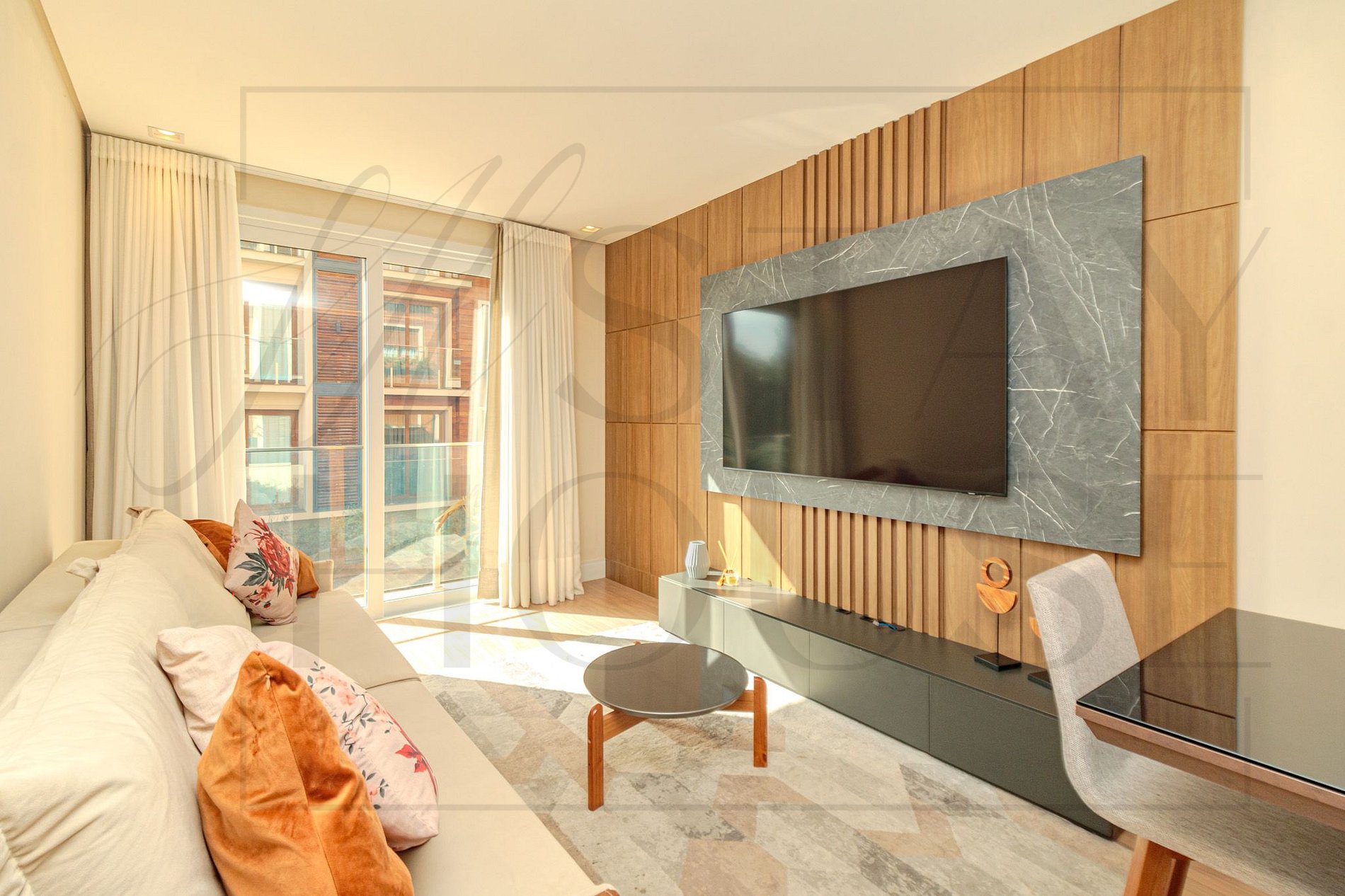 Sala de estar com SPLIT e SMART TV e com vista para a parte interna do condomínio + sofá cama de casal.