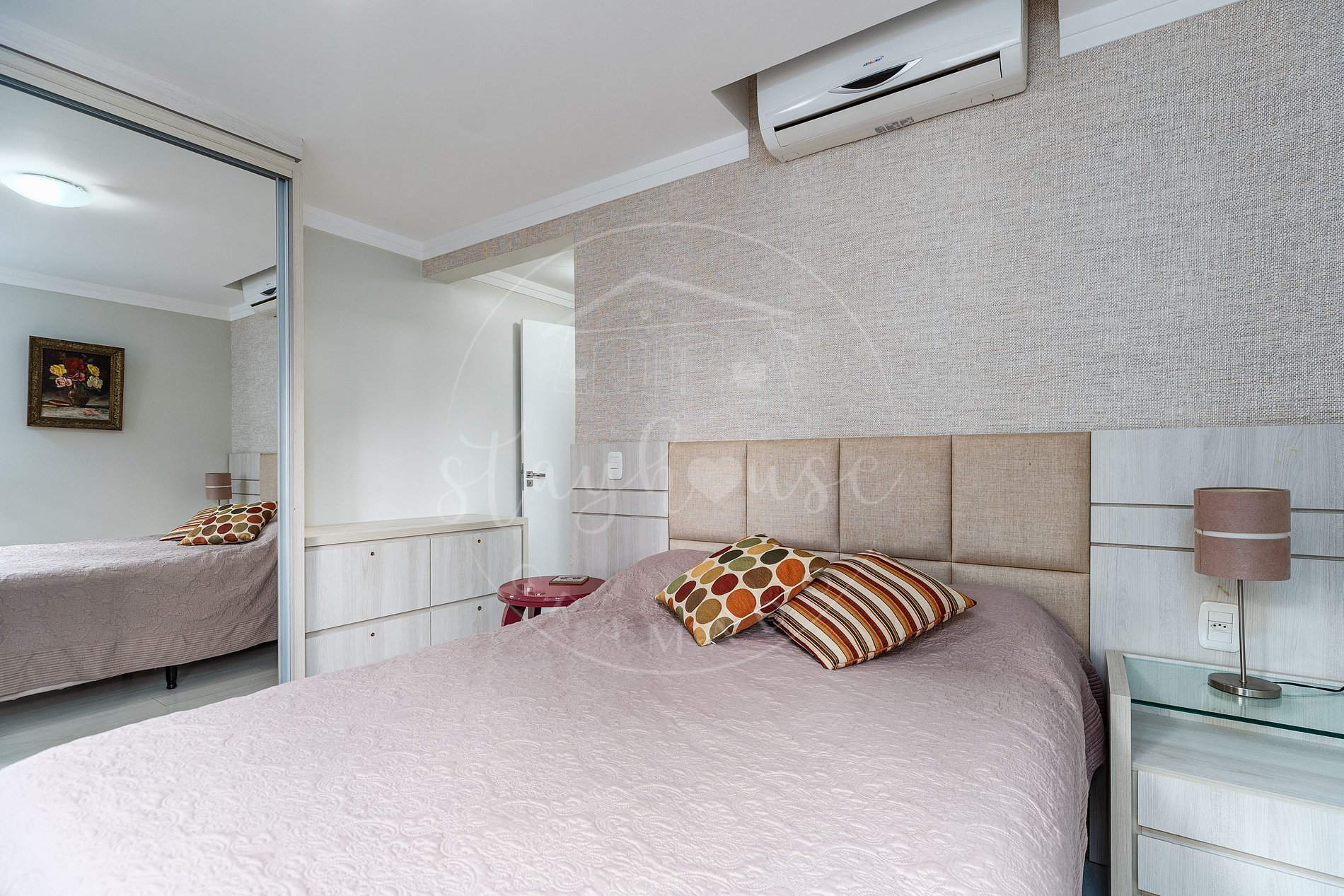 No dormitório temos uma cama queenl, com TV Smart e roupeiro.