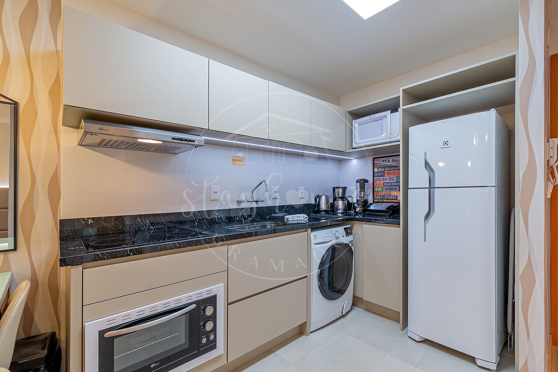O Studio tem conceito aberto, com cozinha super equipada. Sala integrada com sofá cama para 1 pessoa. Black out na sala com TV Smart giratória de 50 polegadas, podendo direcionar pro sofá cama ou pra cama queen.