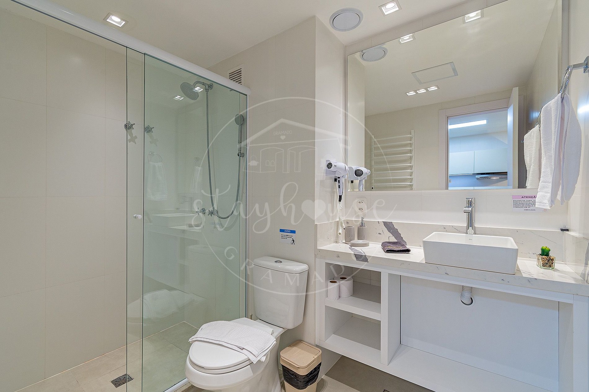 Banheiro social, com secador de toalhas, mantendo sempre aquecidas, e secador de cabelo de parede.