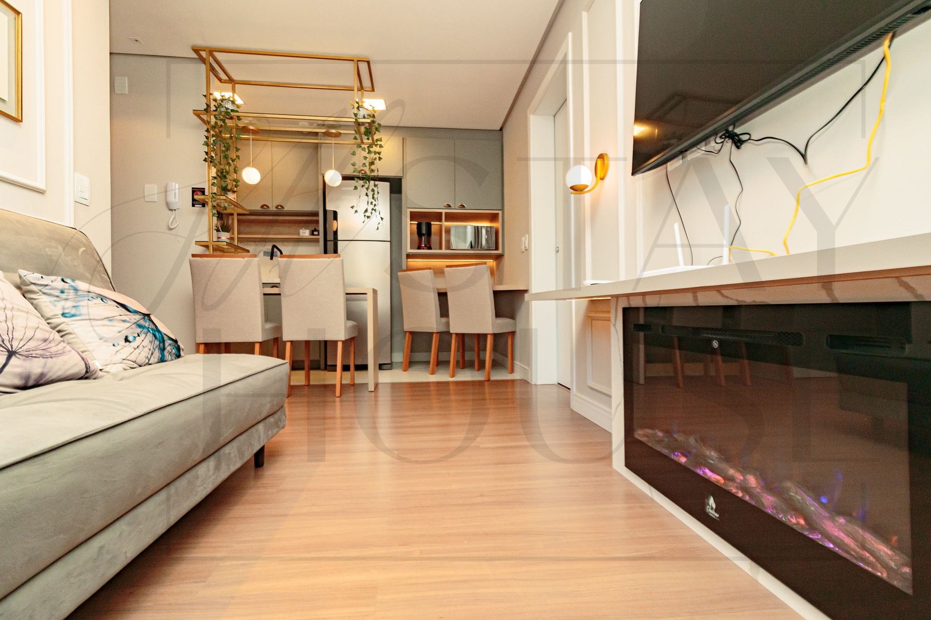 Sala de estar com sofá-cama casal, lareira elétrica, TV Smart, ar condicionado split ( quente e frio )