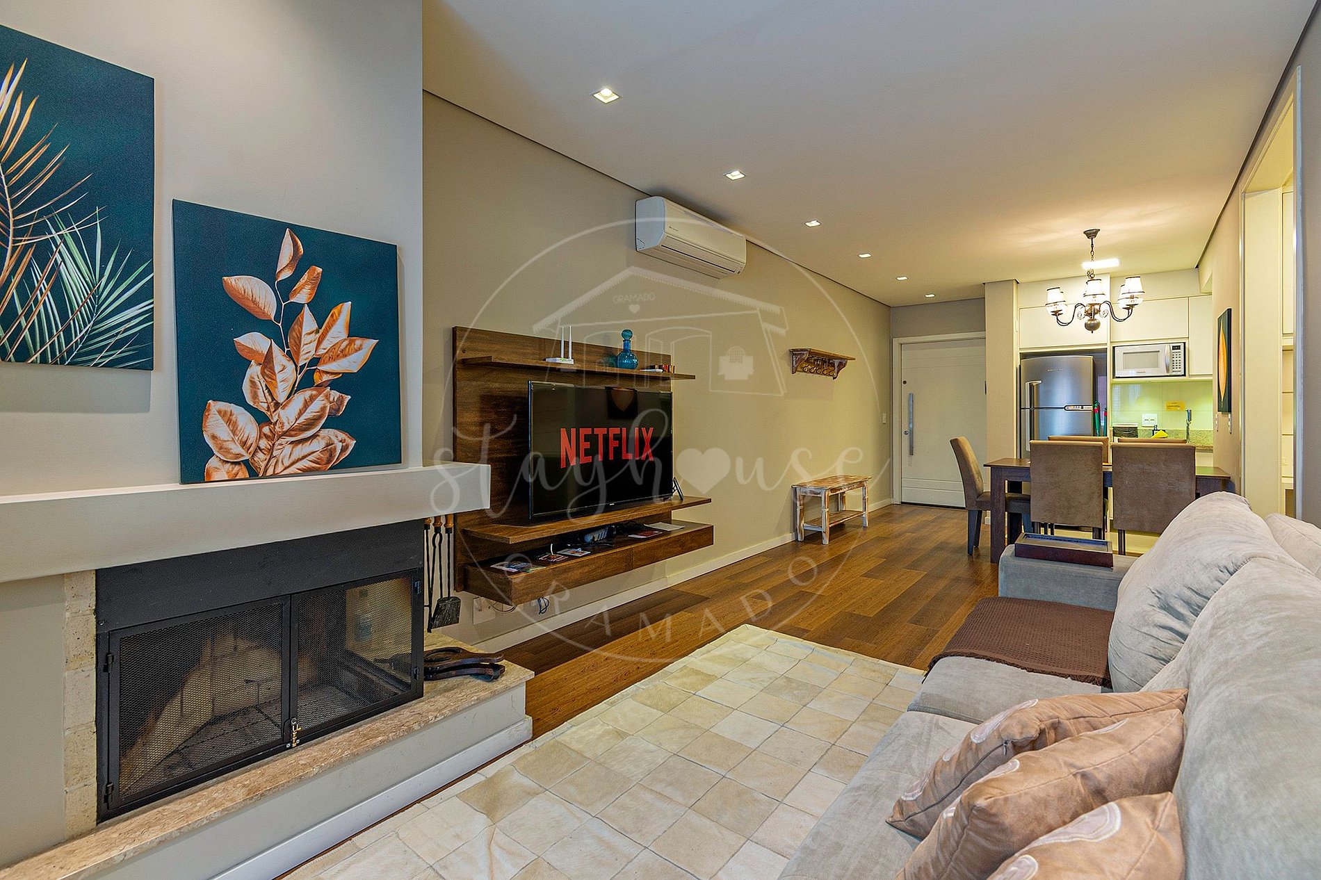 Sala ampla com ar condicionado quente e frio, lareira, cozinha integrada e completa.