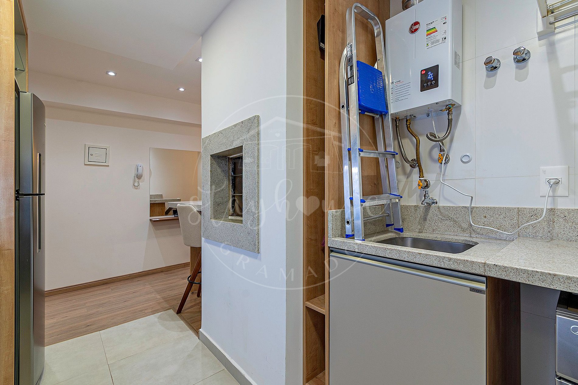 Ainda na sala tem uma bancada de apoio a churrasqueira com 2 banquetas.