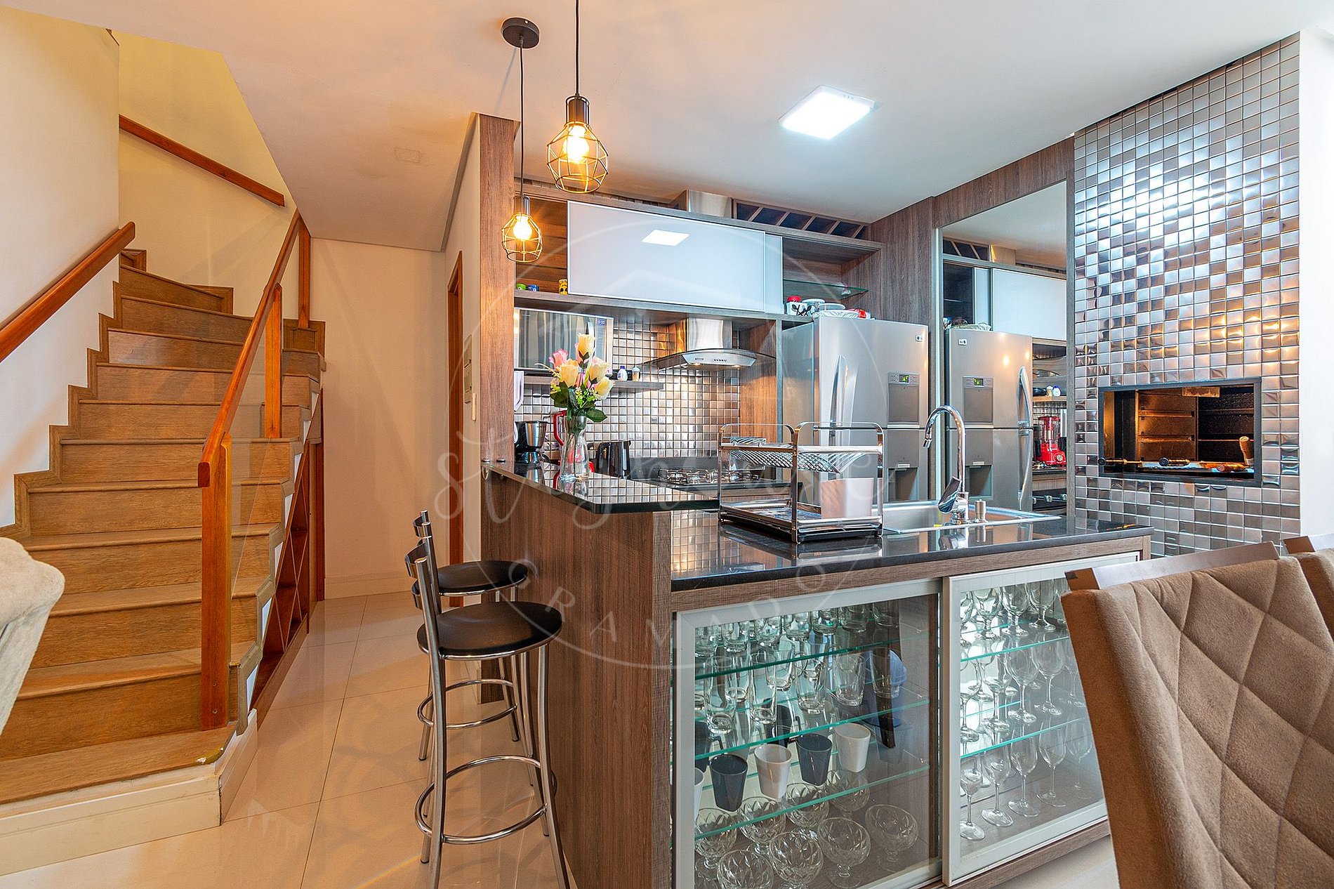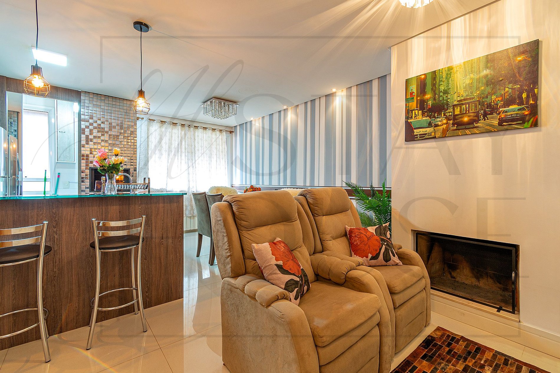 Sala com lareira integrada com cozinha, e area de serviço pequena.